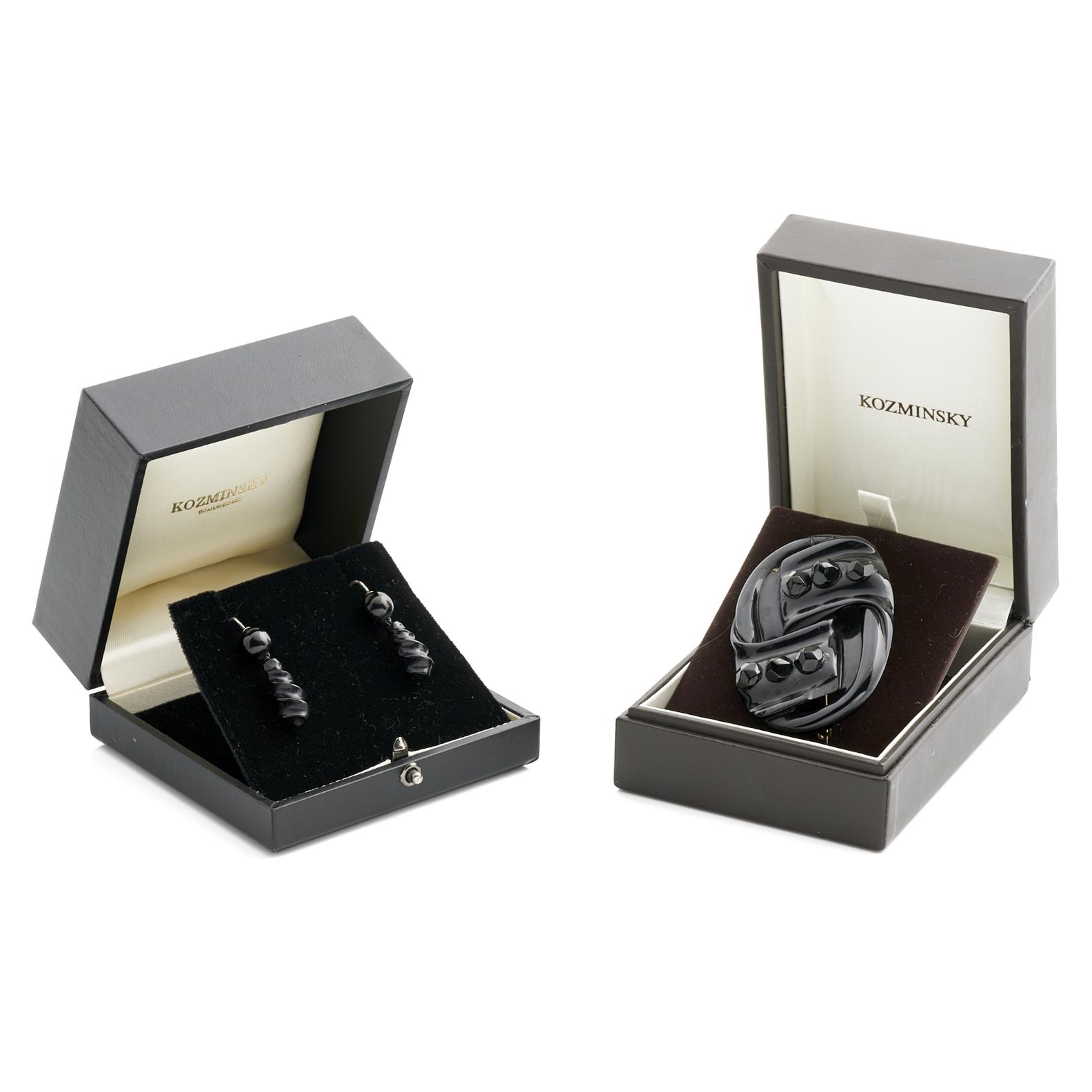 A JET MOURNING SUITE, COMPRISING A PAIR OF EARRINGS TO SHEPHERD HOOK FITTINGS, TOGETHER WITH A LARGE BROOCH, 7 X 4.5CM, RETAILED BY KOZMINSKY, A/F (REPAIR TO BROOCH)