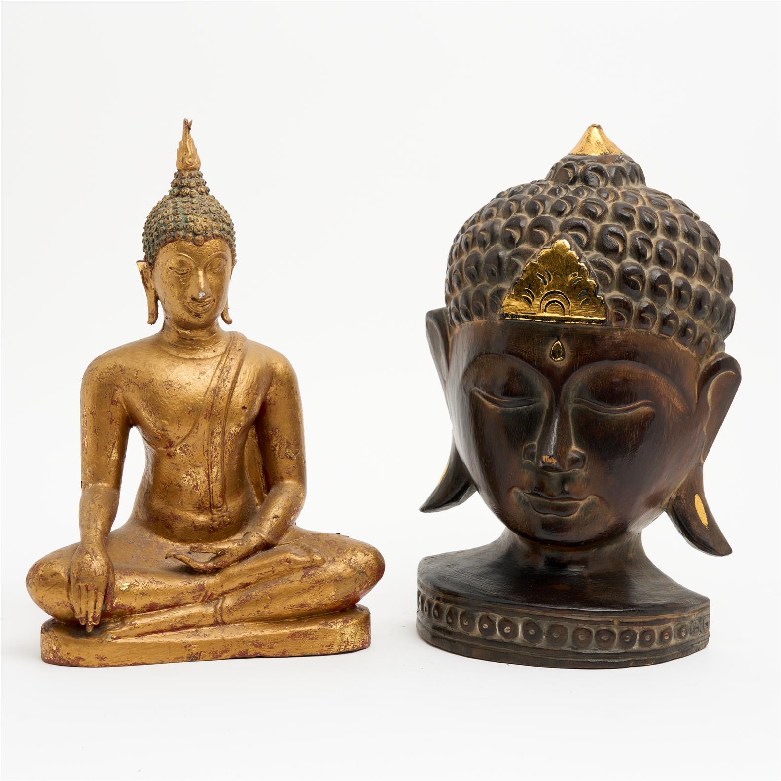 A GILDED CAST METAL SEATED BUDDHA TOGETHER WITH AN EBONIZED BUDDHA HEAD H.34CM