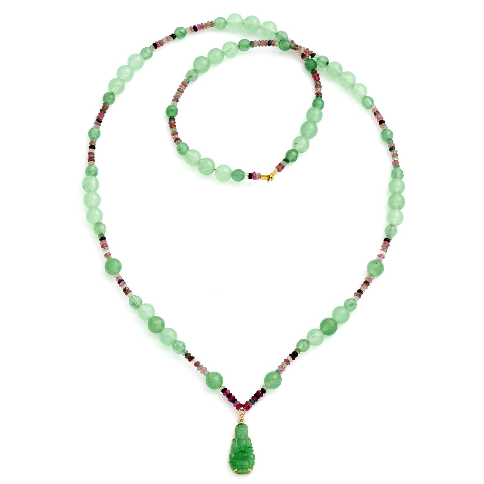 A MULTI COLOURED GEMSTONE NECKLACE WITH BUDDHA PENDANT IN 18CT GOLD, LENGTH 720MM