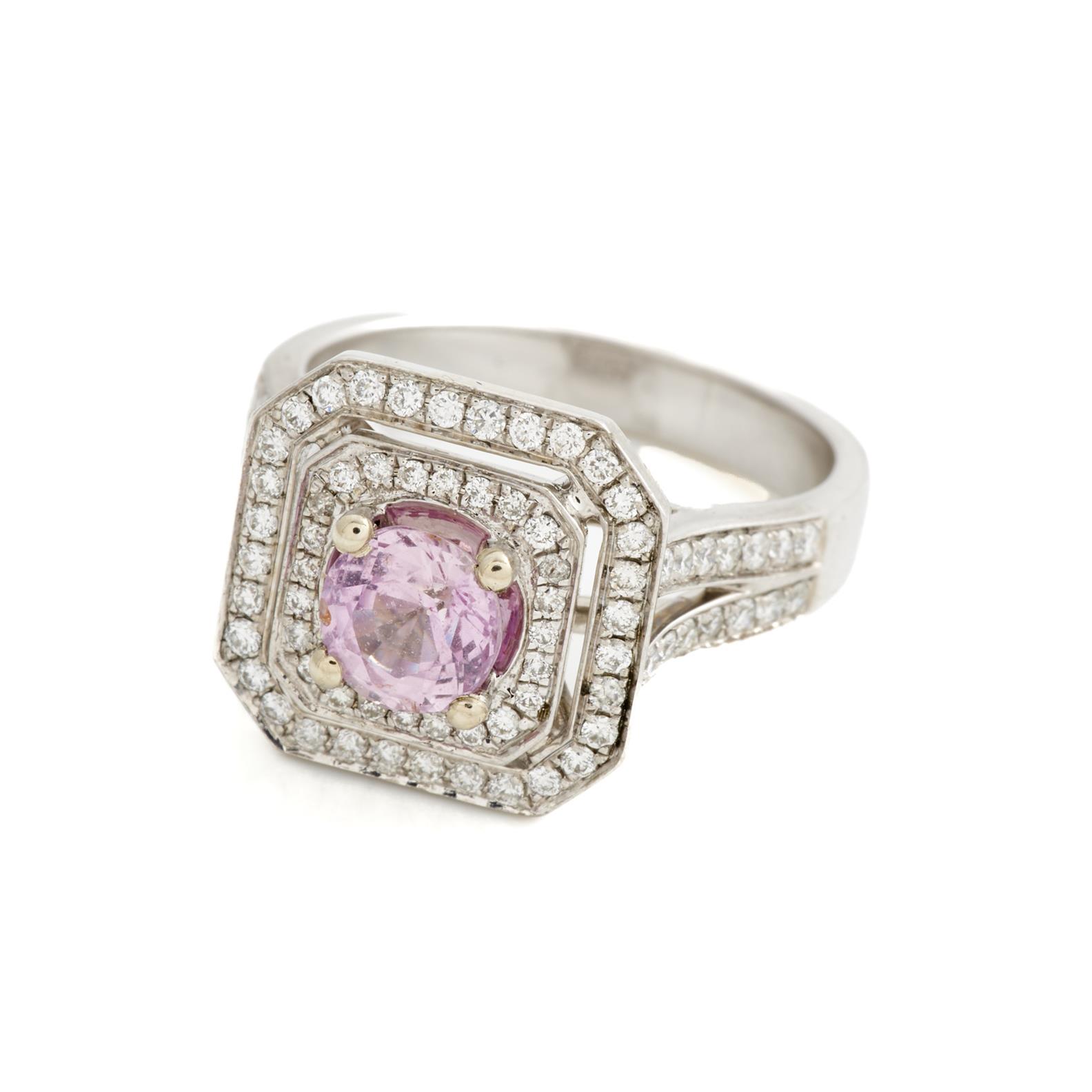 A PINK SAPPHIRE AND DIAMOND RING IN 18CT WHITE GOLD, SIZE N, 7.1GMS