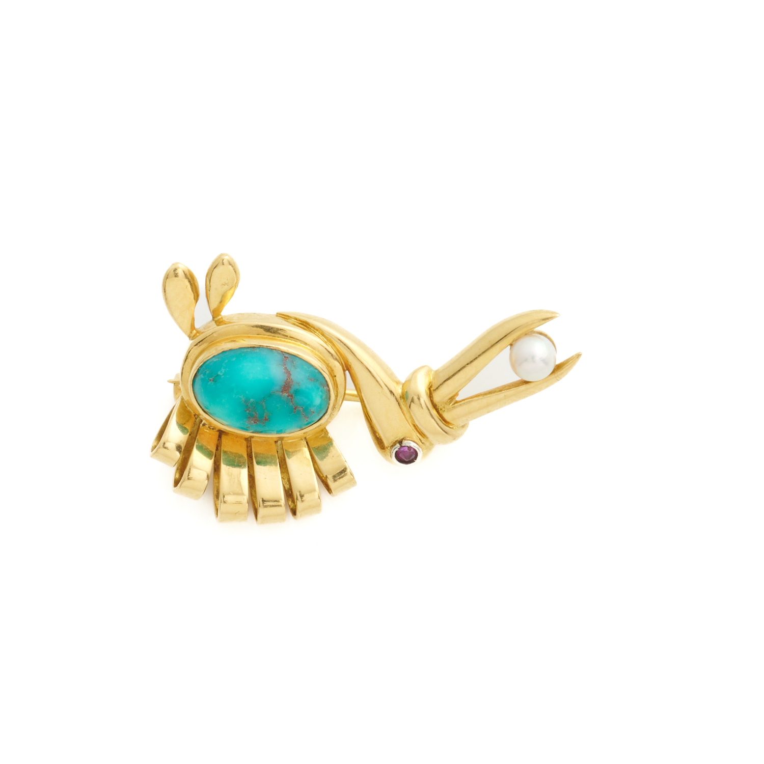A PELICAN MOTIF BROOCH SET WITH TURQUOISE, RUBY AND AKOYA PEARL IN 18CT GOLD, 35MM X 25MM
