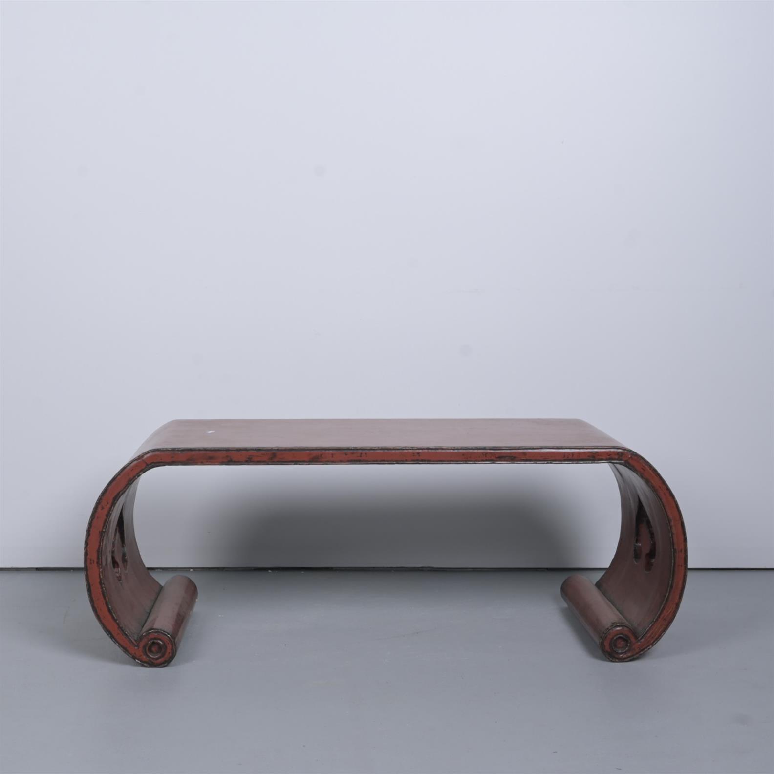 A CHINESE RED LACQUERED COFFEE TABLE (48CM H X 130CM H X 50CM D)