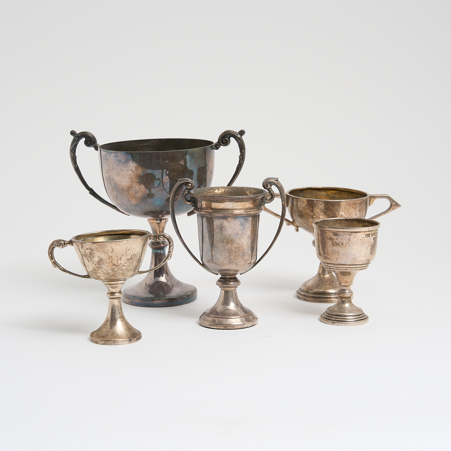 FOUR STERLING SILVER CHALICES AND ONE LARGER SILVER PLATED 192G STERLING SILVER H.13CM (LARGEST)
