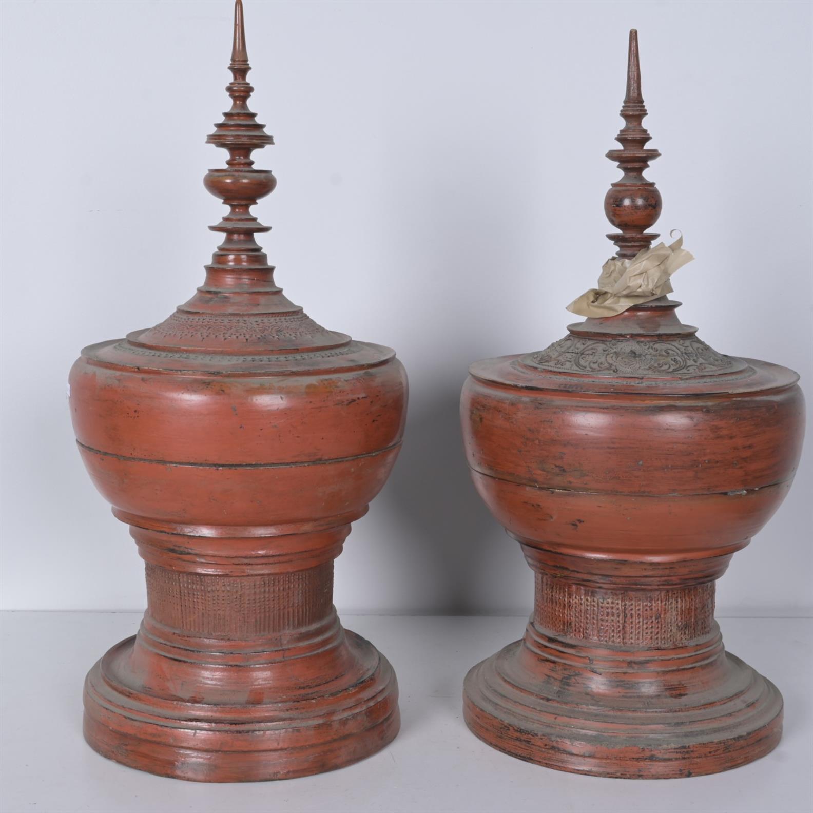 A PAIR OF BURMESE RED LACQUERED CEREMONIAL OFFERING VESSELS (A/F) (76CM H X 32CM DIA)