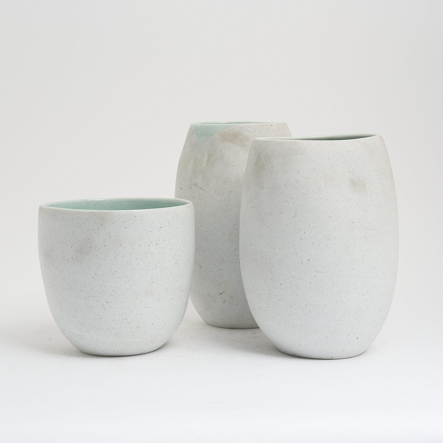 THREE CERAMIC POTS WITH GLAZED INTERIORS BY TAMARA HAHN (TWO TALL, ONE SQUAT) H.28CM (TALLEST)