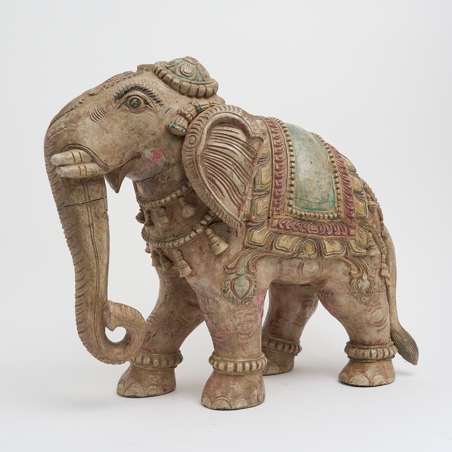 A CARVED WOODEN POLYCHROME INDIAN ELEPHANT L.52CM