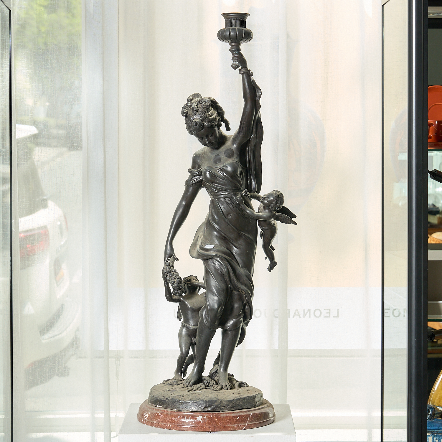 A TALL FRENCH SPELTER FIGURAL CANDLE STICK OF A WOMAN WITH CHERUBS MOUNTED ON A ROUGE MARBLE BASE H.96CM