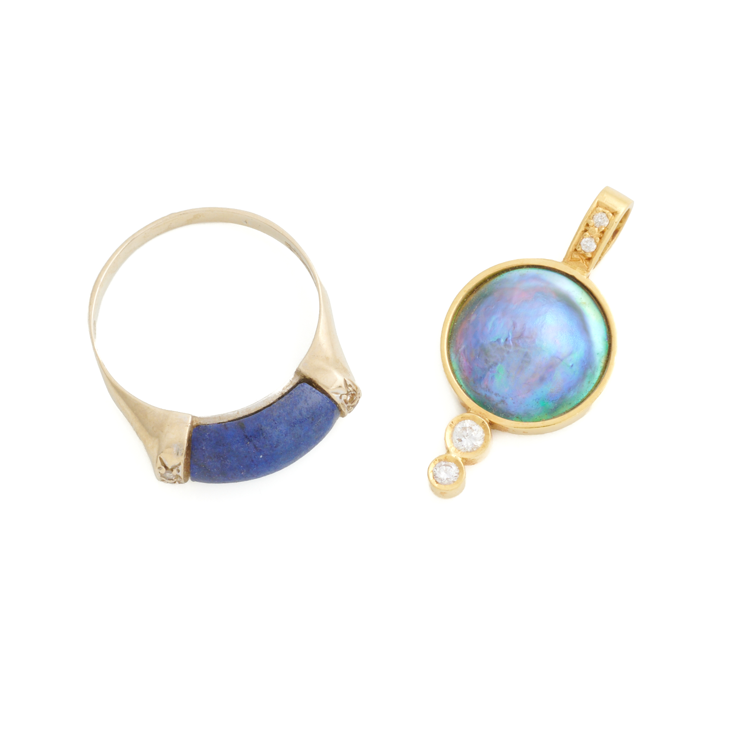 FROG, AN ABALONE SHELL AND DIAMOND PENDANT IN 18CT GOLD, 30MM, 3.1GMS, TOGETHER WITH AN UNSIGNED LAPIS LAZULI AND DIAMOND RING IN 14CT WHITE GOLD, SIZE S, 3.1GMS