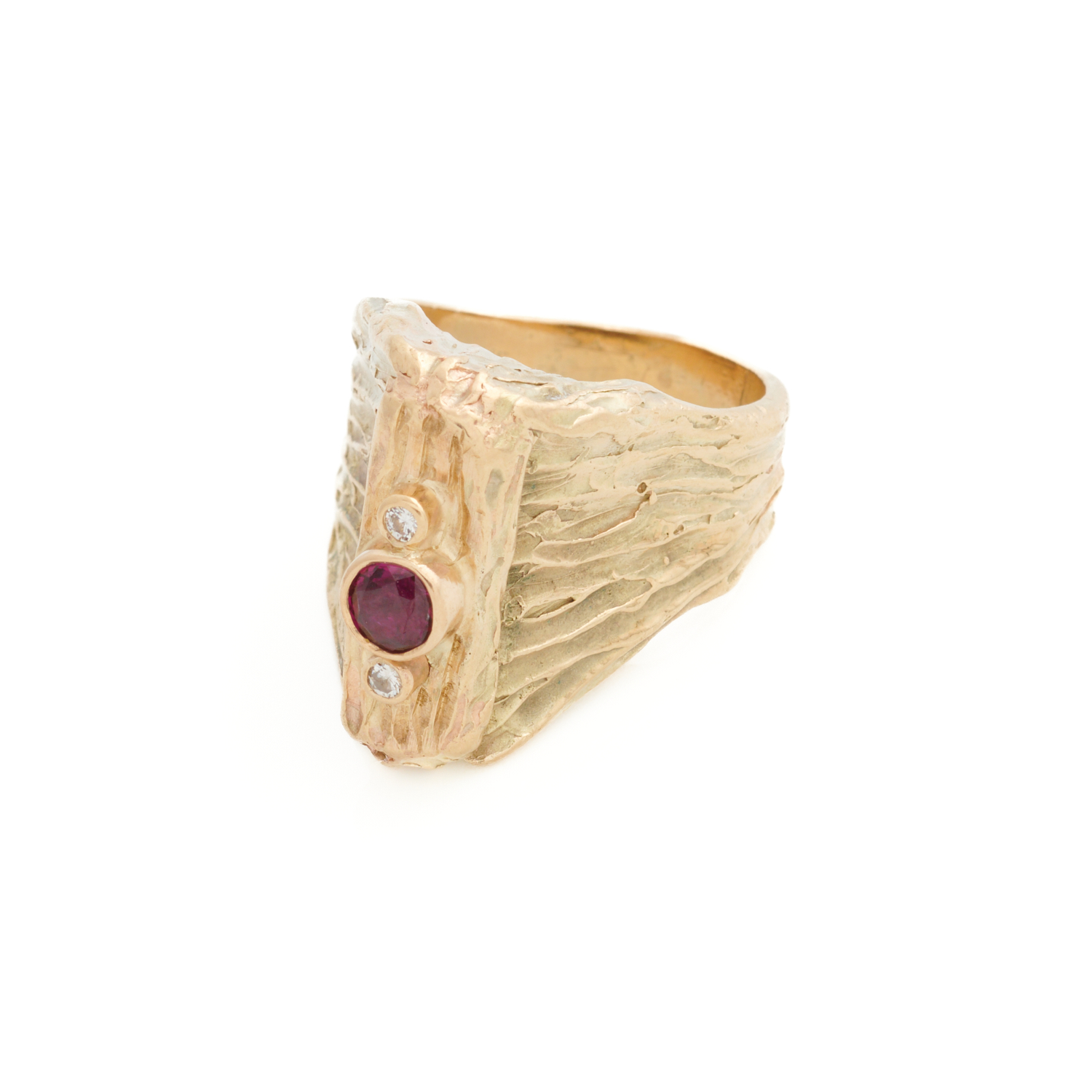 A RUBY AND DIAMOND RING IN TEXTURED 9CT GOLD, THE RUBY WEIGHING APPROXIMATELY 0.35CTS, SIZE M, 14.3GMS