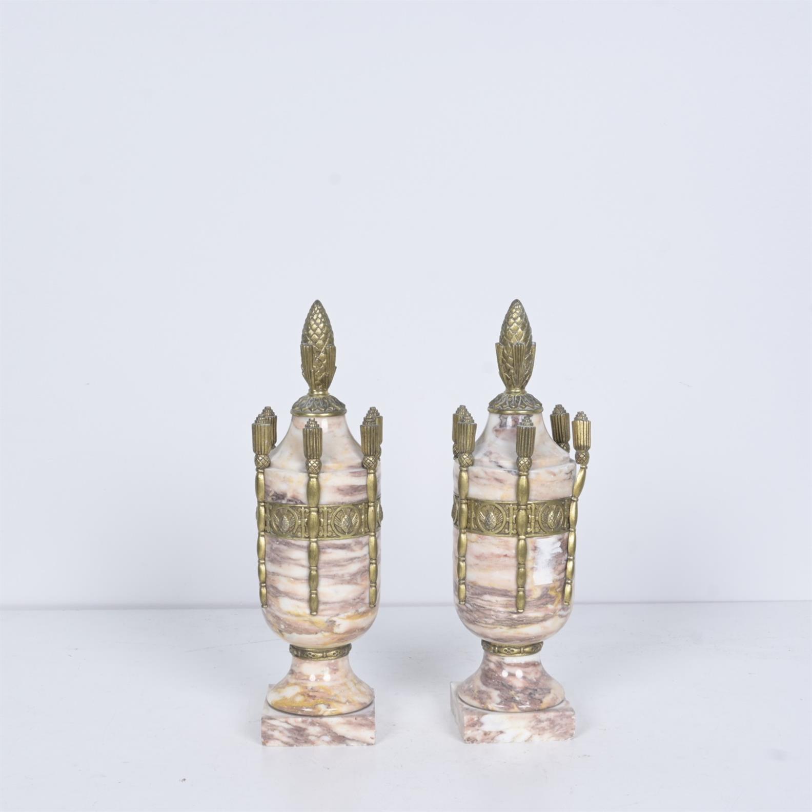 A PAIR OF EARLY 20TH CENTURY FRENCH MARBLE URNS (A/F) (44CM H)