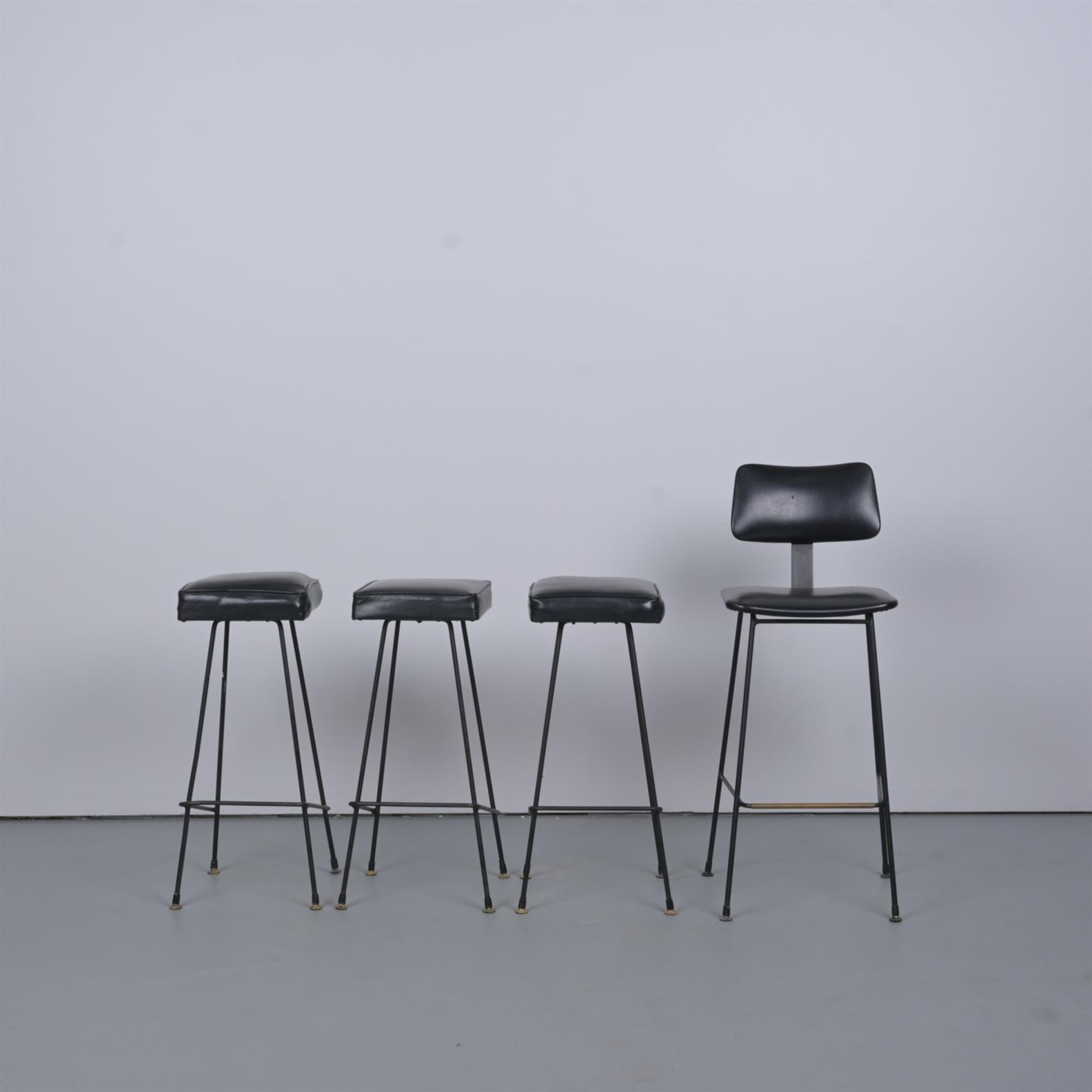 A GROUP OF THREE METAL STOOLS TOGETHER WITH ANOTHER (96CM H X 38CM W X 49CM D)