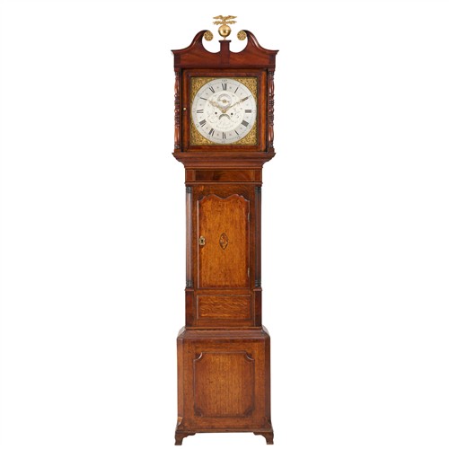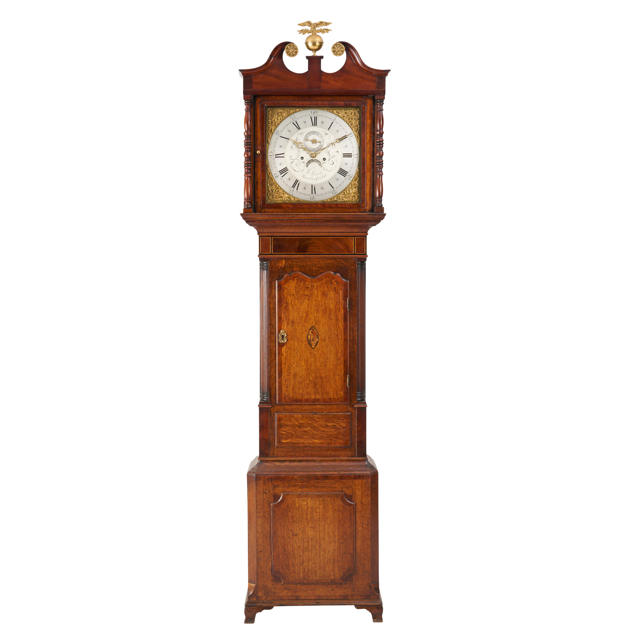 The eight-day movement with anchor escapement striking on a bell, the silvered and decoratively engraved Roman numeral dial with subsidiary seconds dial and calendar aperture within foliate brass spandrels, the glazed hood with swan-neck pediment centred on a brass spread-eagle and orb final above flanking turned columns, the trunk of typical form with a door with shaped top flanked by a pair of fluted quarter-columns on the moulded plinth base on bracket feet, the predominantly oak case inlaid throughout with mahogany fields, cross-banding, and decorative details