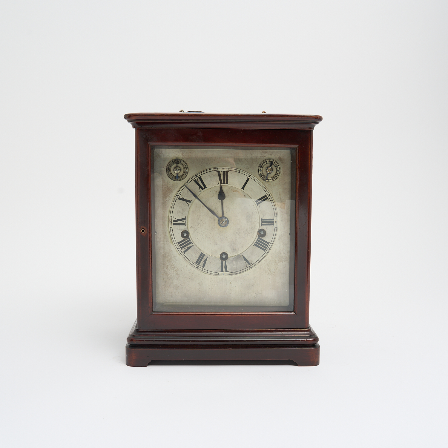 A JUNGHANS WALNUT CASED MANTLE CLOCK WITH 30 HR MOVEMENT, WITH MINIATURE SYMPHONIUM DISC PLAYER IN THE LIFT UP TOP, H.28CM