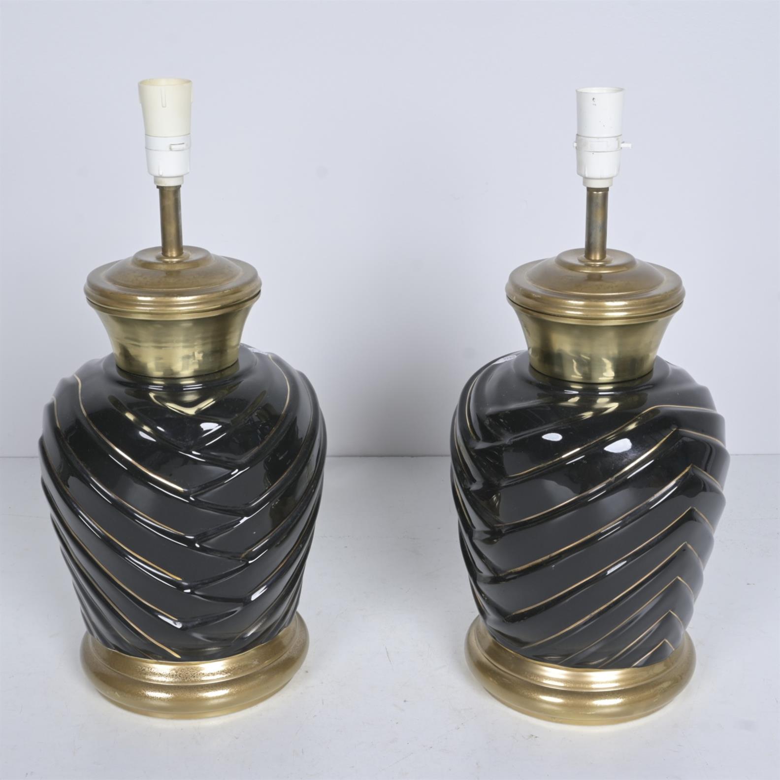 A PAIR OF BLACK GLAZED CERAMIC TABLE LAMPS (48H CM)