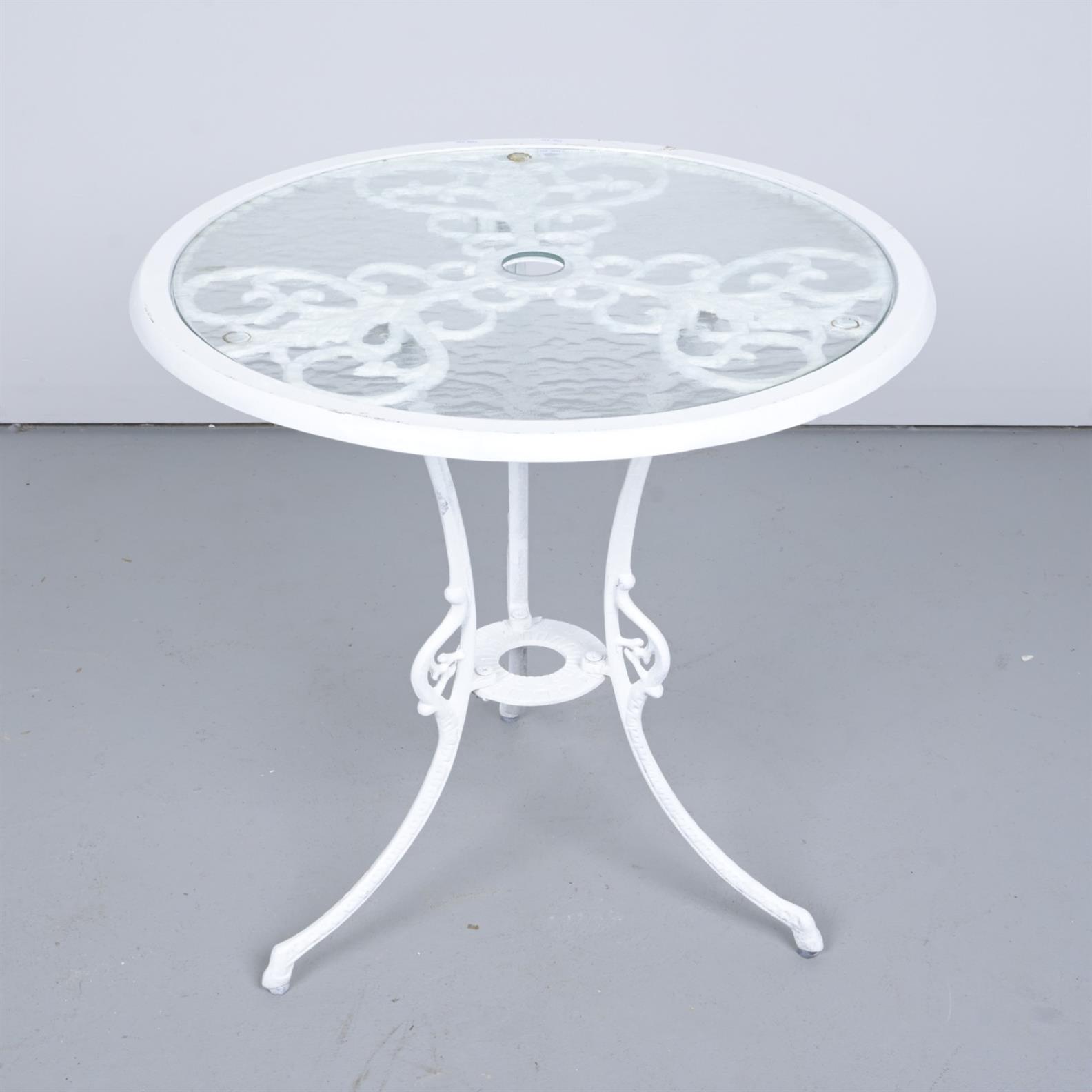 A WHITE METAL OUTDOOR TABLE WITH GLASS TOP (64H X 64DIA CM)
