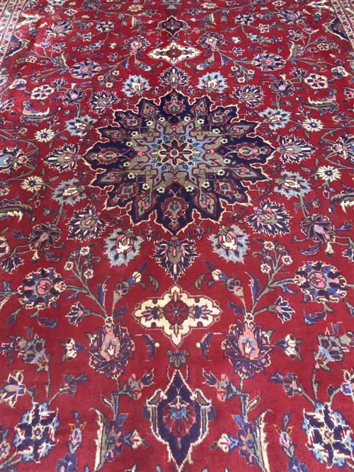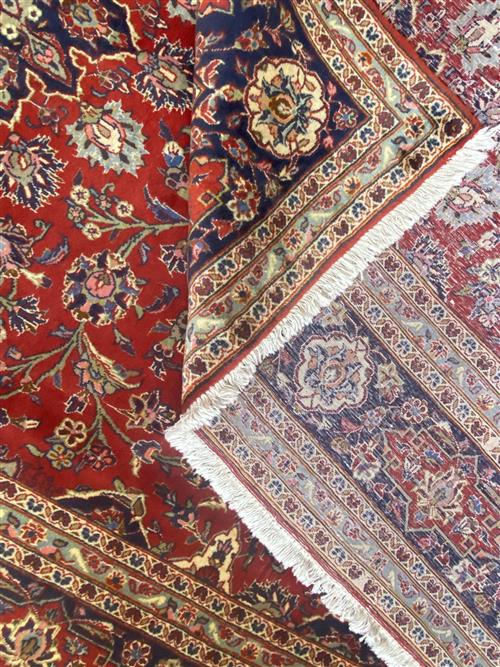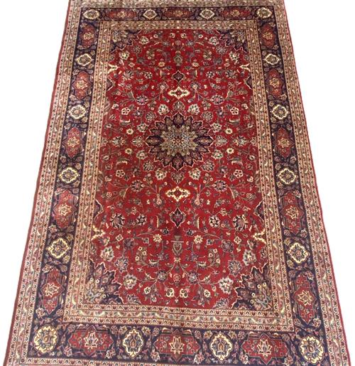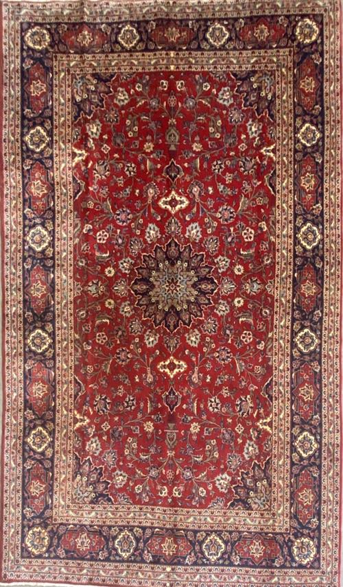 FINE HIGH-QUALITY WOOL PILE. GALLERY EXHIBITED. FINELY HAND-KNOTTED CITY WEAVE FROM NORTH ISFAHAN PROVINCE WITH RARE KASHAN DESIGN OF A SUNBURST MEDALLION OF PALMETTES & QUARTERED CORNER MEDALLIONS IN A RUBY RED FIELD OF SHAH ABBASSI PALMETTES & BLOSSOMING FLORAL SPRAYS IN SHADES OF CREAM, INDIGO & CORNFLOWER BLUE. UNIQUE BORDER OF CARTOUCHES CONTAINING PALMETTES & FLORAL WREATHS.