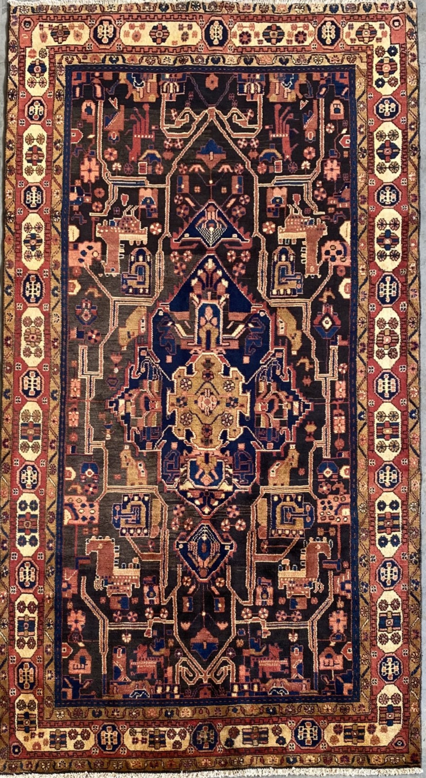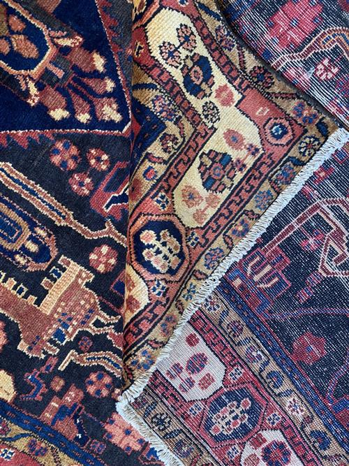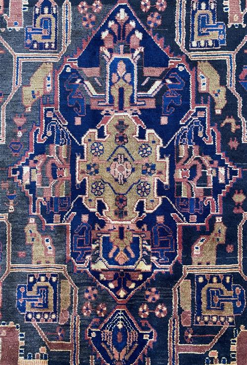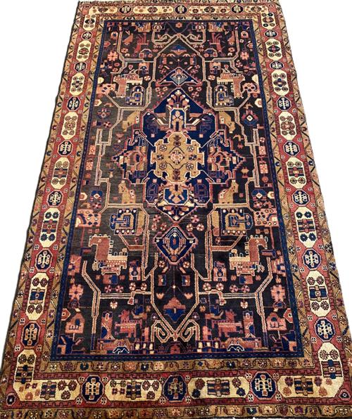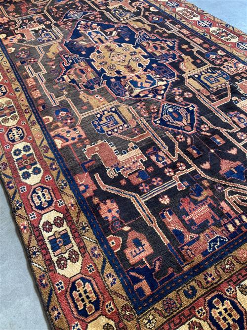 HAND-KNOTTED VILLAGE WEAVE FROM THE HAMADAN PROVINCE WITH NATURAL ABRASH DISCOLOURATION & DESIGN OF A CENTRAL BOLD MEDALLION WITHIN A FIELD OF VARYING FLORAL MOTIFS & ANGULAR GEOMETRIC PATTERNS. BORDER OF GEOMETRIC PATTERNS & FLOWER HEADS. THE ENTIRE IN SHADES OF INDIGO, CHARCOAL, CREAM, TERRACOTTA & BLUE.