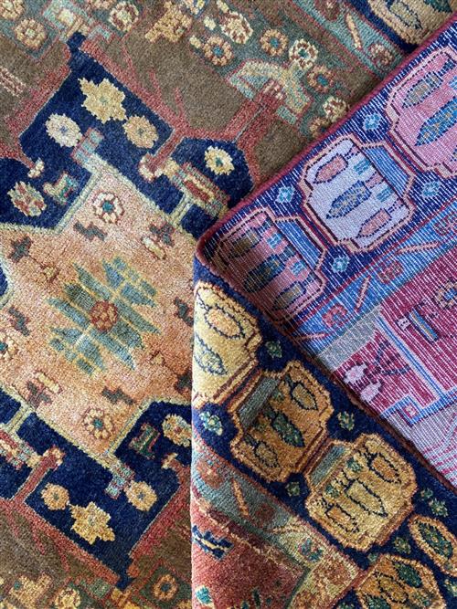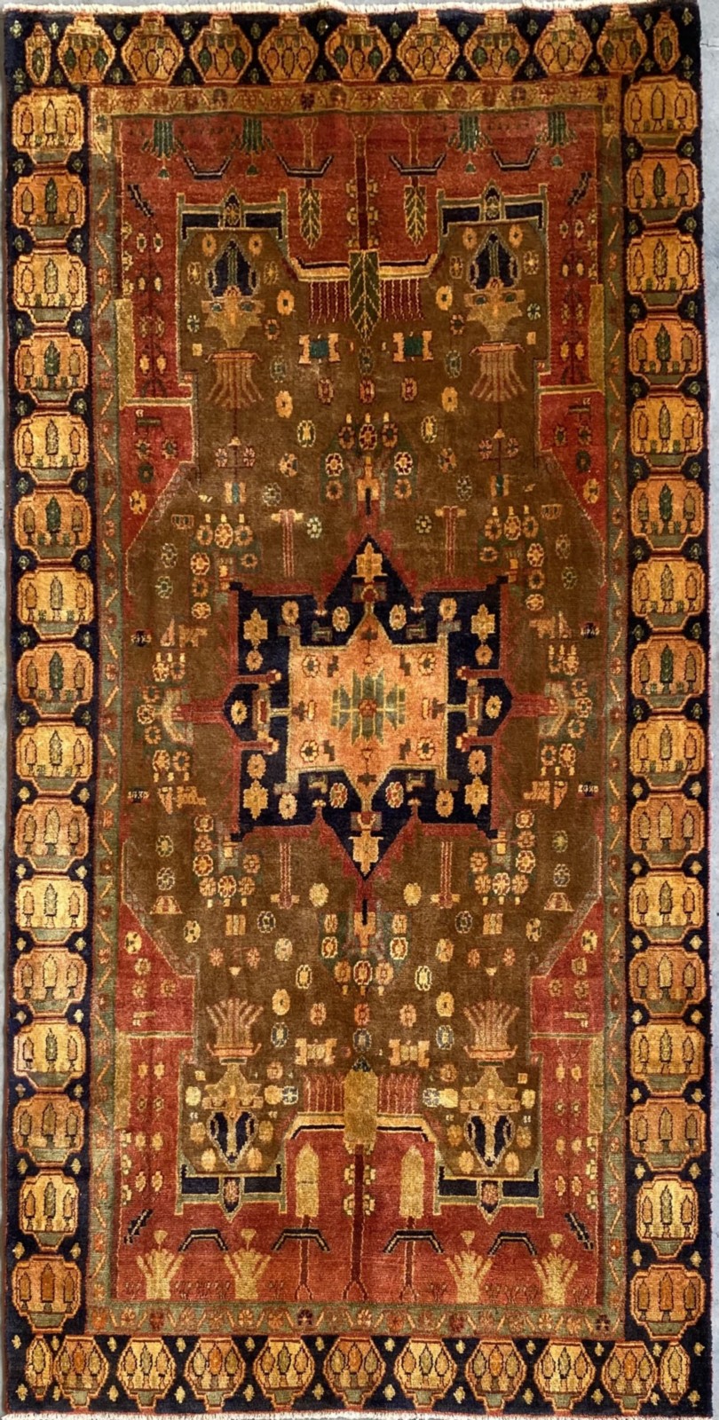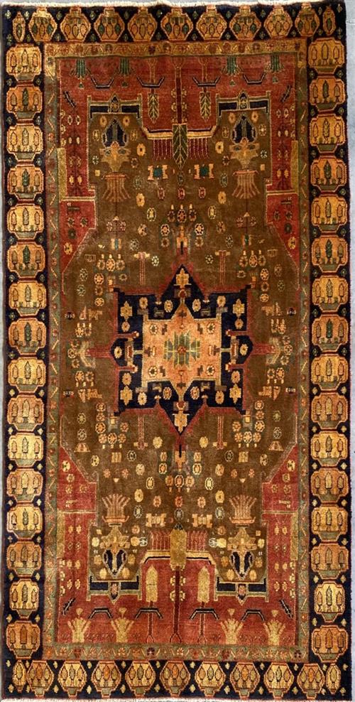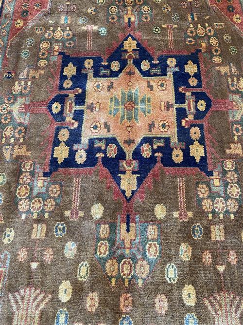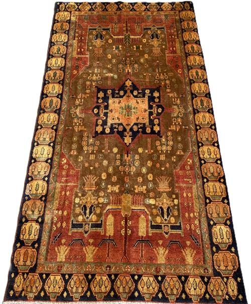 A WOOL PILE & VEGETABLE DYES. HAND-KNOTTED SEMI-TRIBAL WEAVE FROM THE KURDISTAN REGION WITH BOLD ANGULAR MEDALLION IN CORNER MEDALLIONS IN A FIELD OF FLOWER HEADS. PANELLED BORDER OF CYPRESS TREES. THE ENTIRE IN SHADES OF CARAMEL, TERRACOTTA, INDIGO, SAFFRON & GREEN.