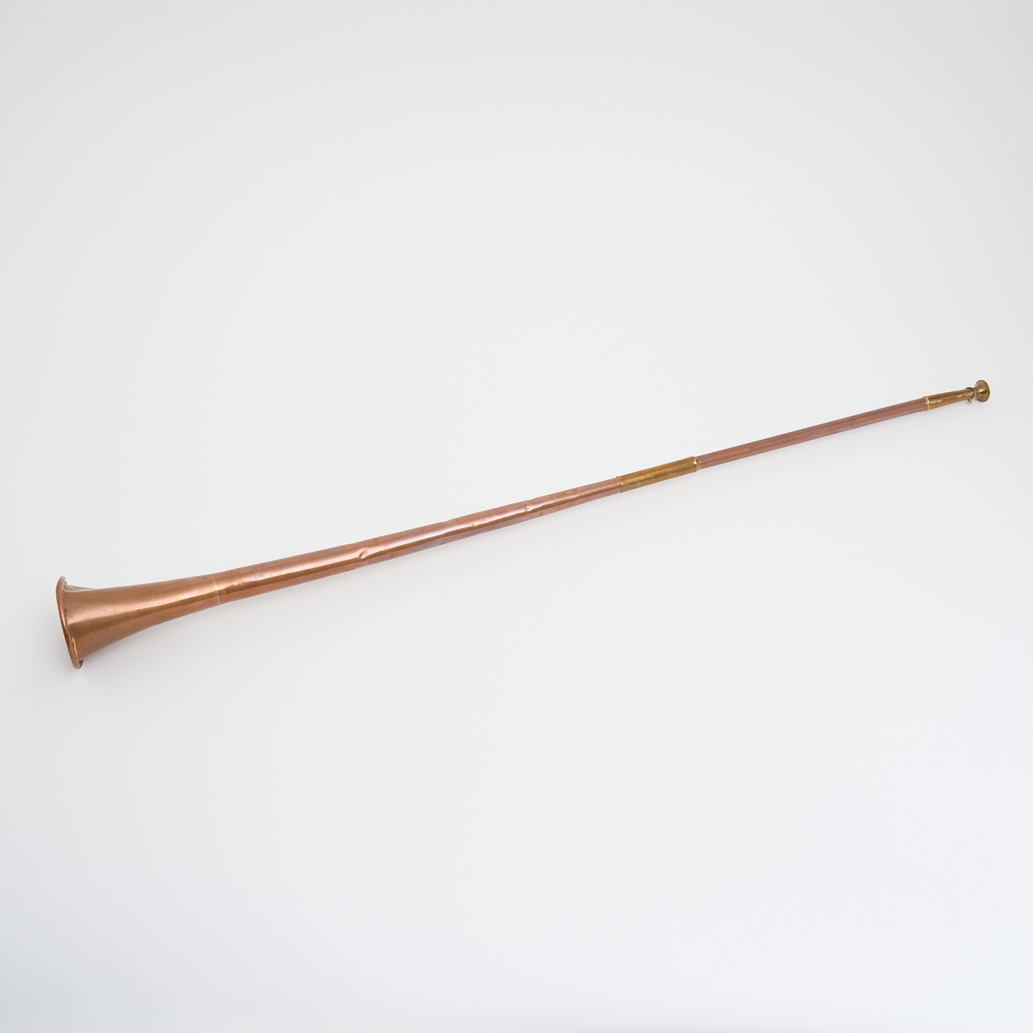 A 19TH CENTURY ENGLISH COPPER AND BRASS TWO PIECE FOX HUNTING HORN L.84CM