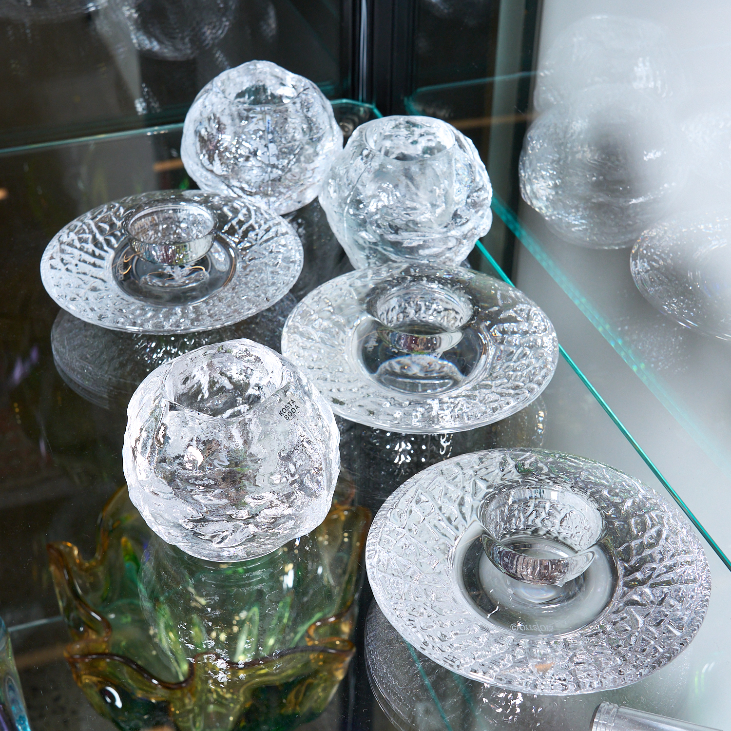 THREE KOSTA BODA SNOWBALL CANDLEHOLDERS TOGETHER WITH THREE ORREFORS CANDLE HOLDERS W.13CM (LARGEST)