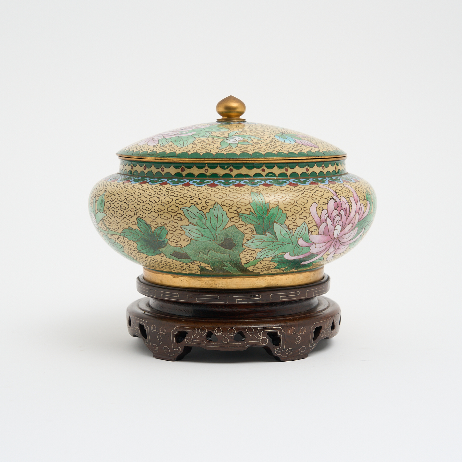 A CLOISONNÉ LIDDED BOWL ON CARVED AND INLAID WOODEN STAND W.20CM