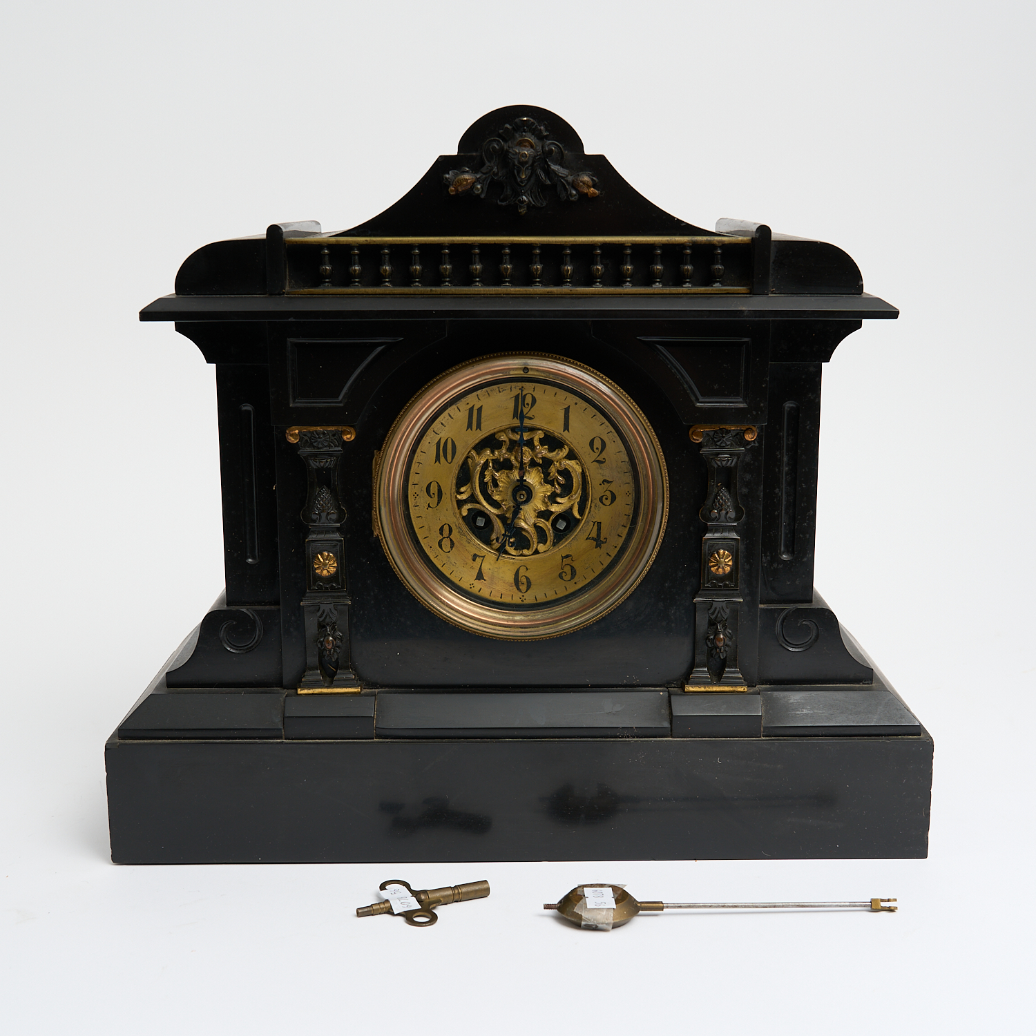 A 19TH CENTURY FRENCH BLACK MARBLE AND BRONZE MOUNTED MANTLE CLOCK (WITH KEY AND PENDULUM) W.38CM