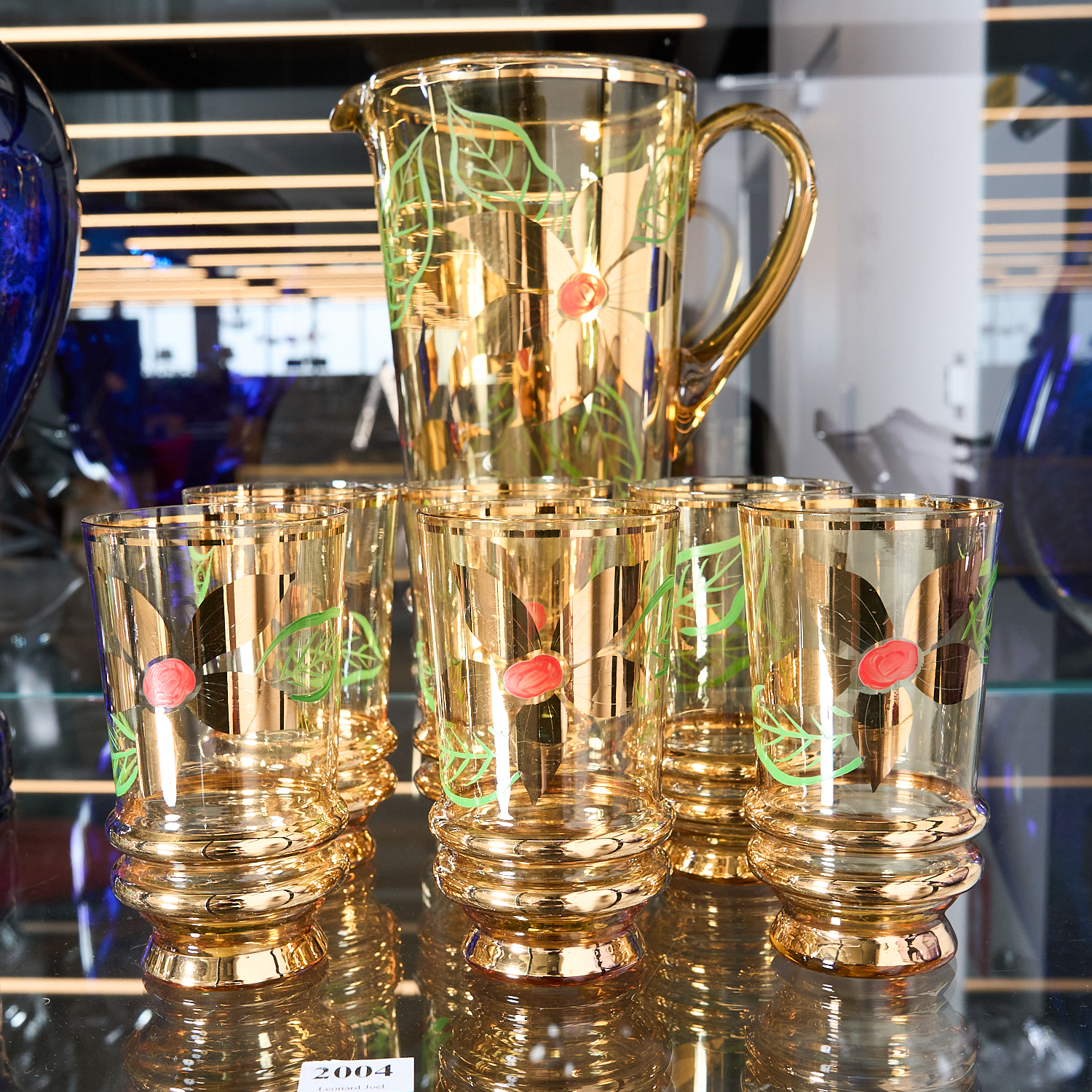 A RETRO AMBER COLOURED 7 PIECE JUG AND TUMBLER SET H.25CM