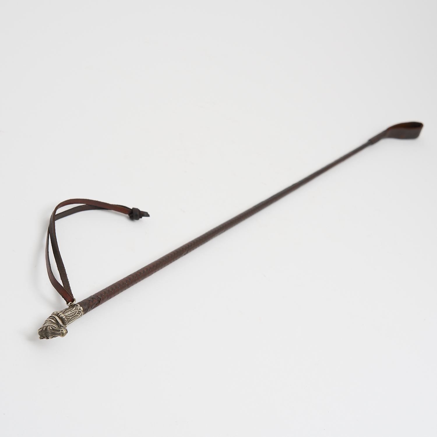 A STERLING SILVER HORSE HEAD MOUNTED LEATHER RIDING CROP L.62CM