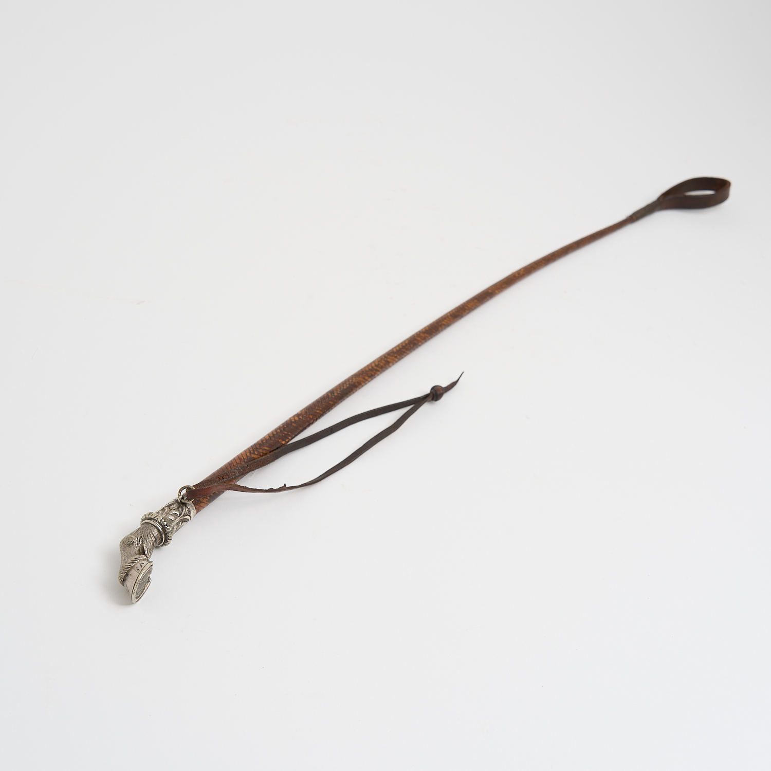 A STERLING SILVER HORSE HOOF MOUNTED LEATHER RIDING CROP L.66CM