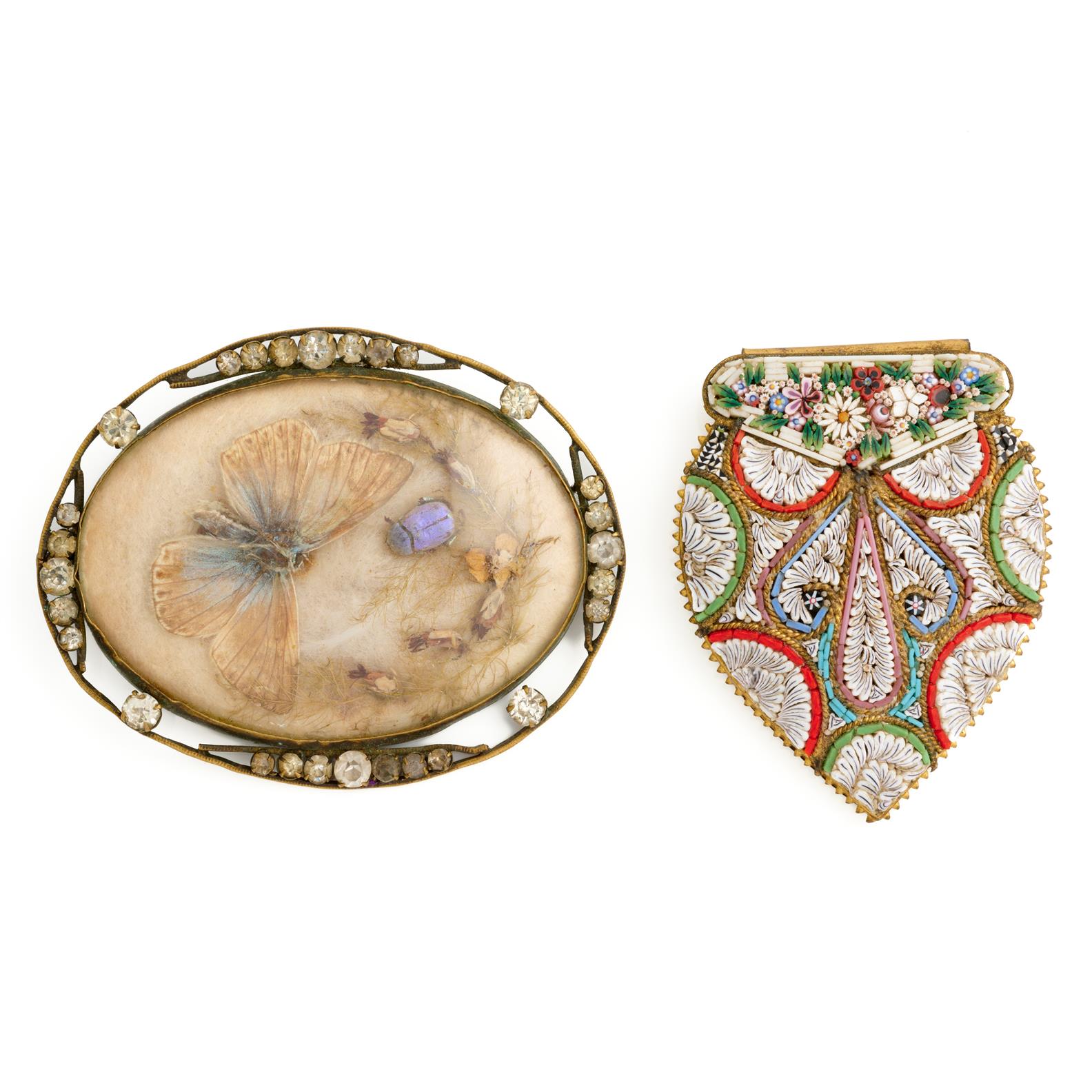 AN ENTOMOLOGY SPECIMEN BROOCH IN BASE METAL, 75MM X 60MM TOGETHER WITH A MICRO MOSAIC BELT BUCKLE IN BASE METAL, 60MM X 48MM