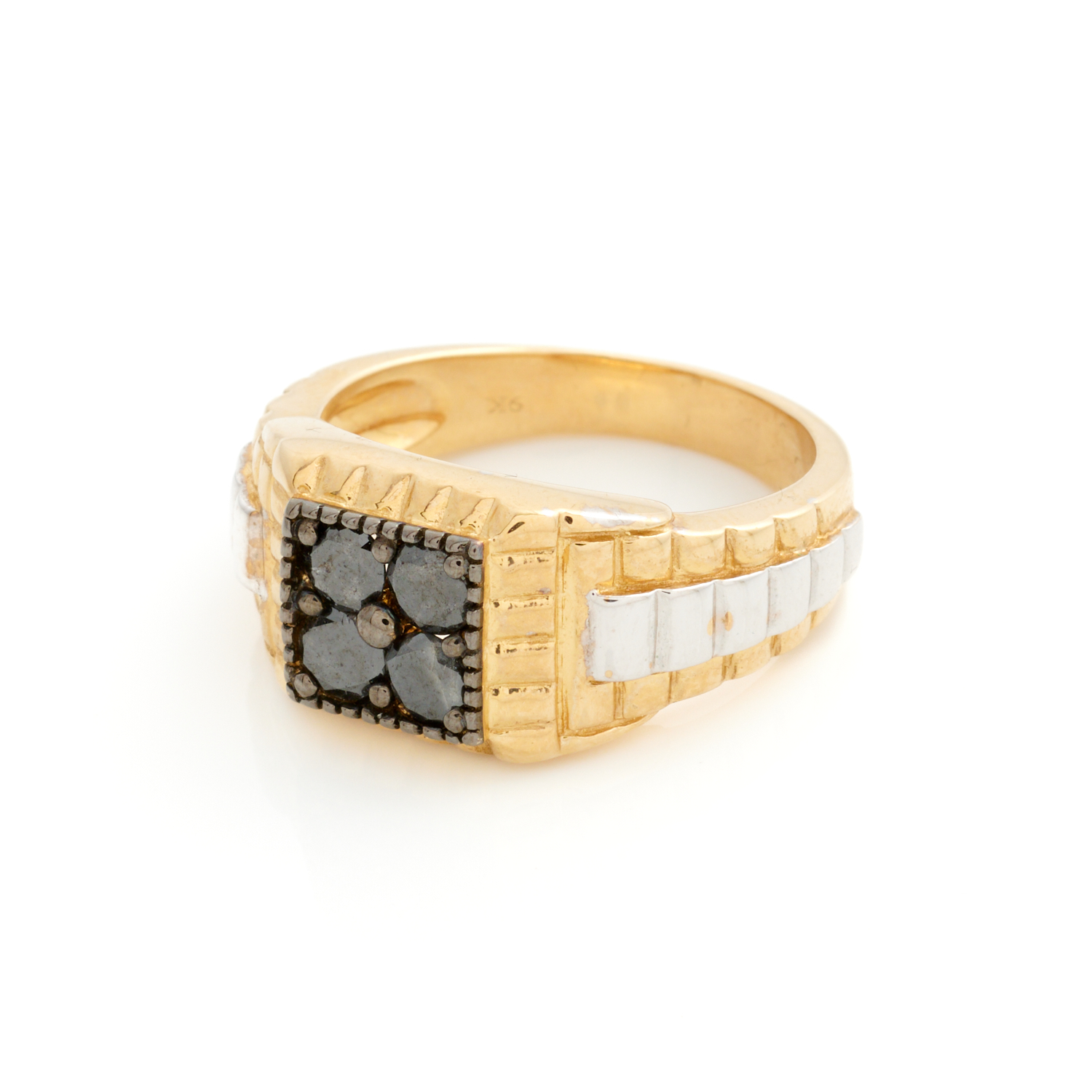 A BLACK DIAMOND RING IN 9CT TWO TONE GOLD, SIZE U 1/2, 9.8GMS