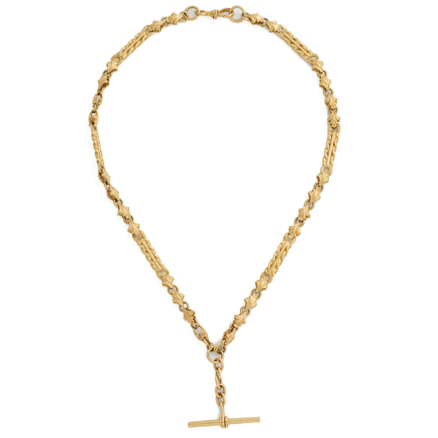 A FANCY LINK CHAIN TO A T-BAR PENDANT IN 9CT GOLD, 480MM, 46.6GMS