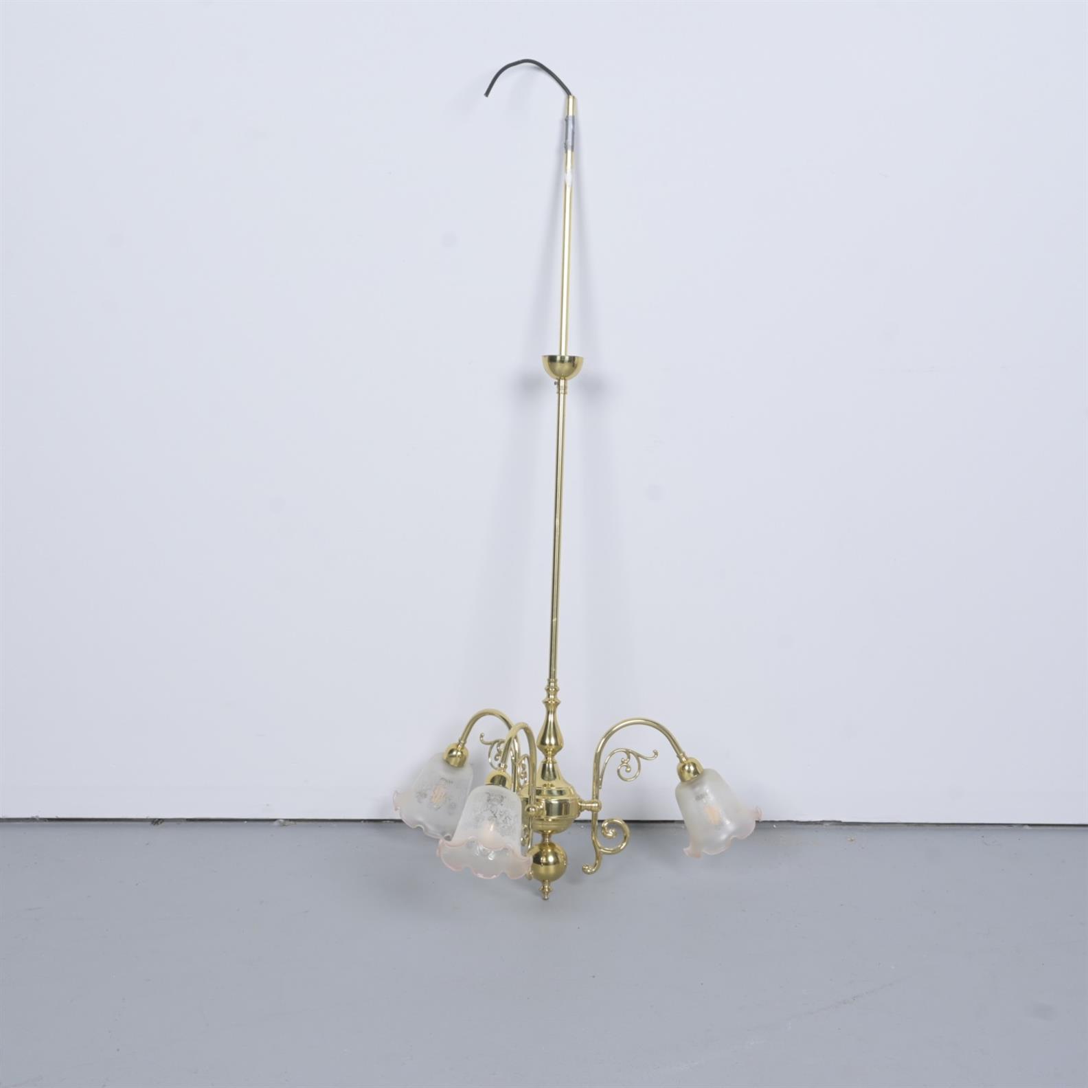 A VICTORIAN BRASS THREE GLOBE PENDANT LIGHT (125CM H)