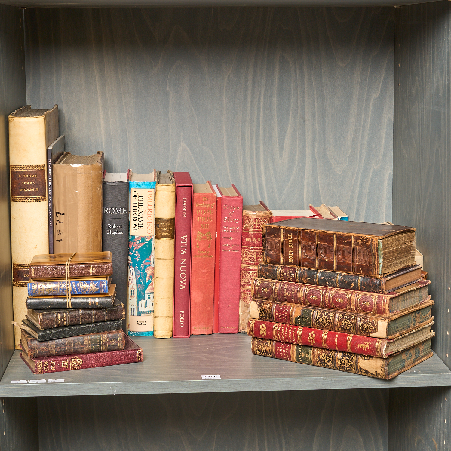 A SHELF OF ANTIQUARIAN AND LATER BOOKS CONCERNING CHRISTIANITY AND THEOLOGY INCLUDING S.THOME SUMMA THEOLOGUE, THE HOLY BIBLE, THE ANGLO SAXON CHURCH VOLUMES I & II (A/F)