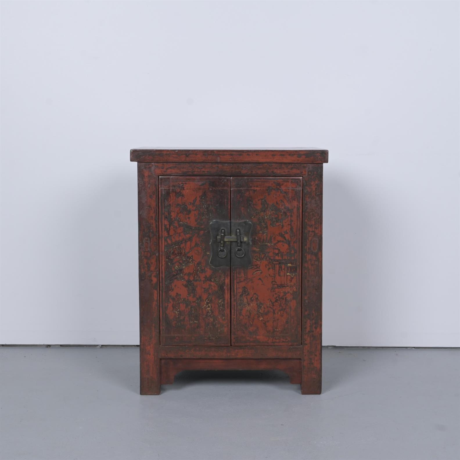 A CHINESE BEDSIDE TABLE WITH A RED GROUND LACQUER FINISH