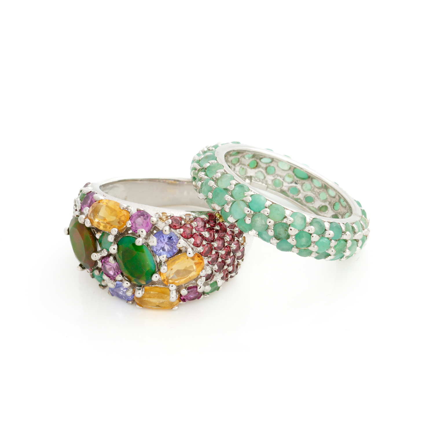 A PAIR OF RINGS IN SILVER, ONE SET WITH GREEN HARDSTONE, SIZE Q, ONE SET WITH SYNTHETIC OPAL AND MIXED PASTE GEMS, SIZE R