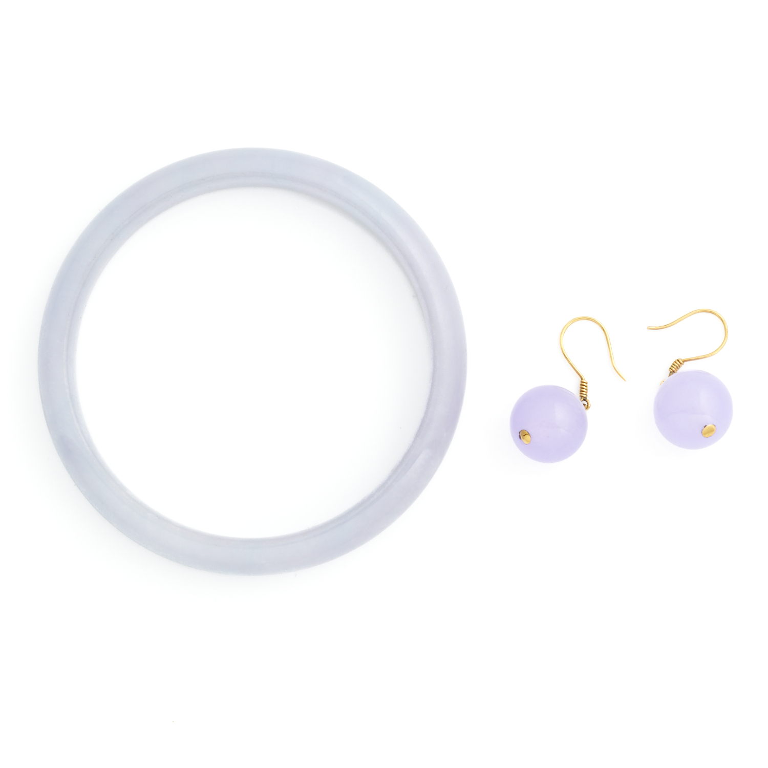 A LAVENDER JADE SUITE, COMPRISING A BANGLE AND A PAIR OF EARRINGS TO SHEPHERD HOOK FITTINGS IN BASE METAL, INNER DIAMETER 60MM
