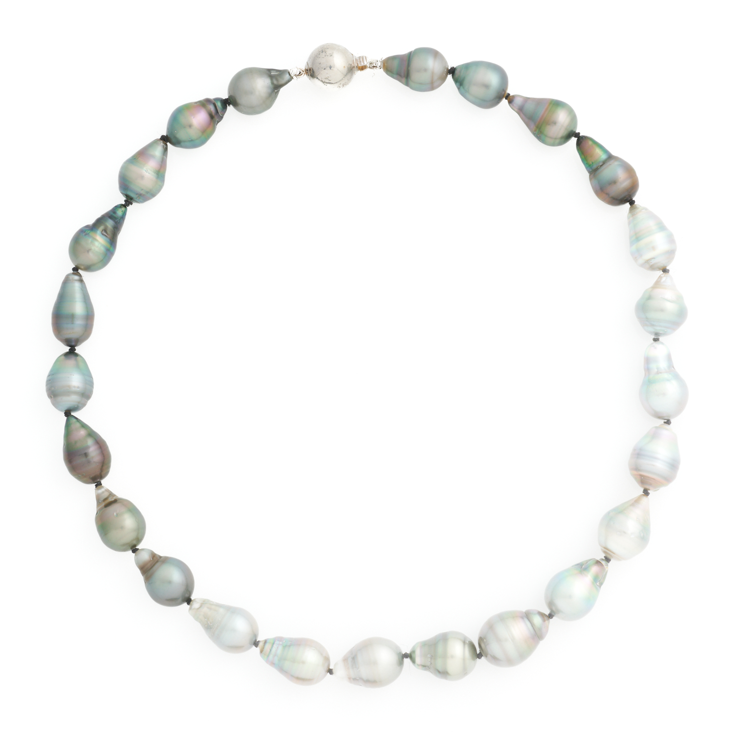 A STRAND OF BAROQUE TAHITIAN PEARLS TO A BALL CLASP IN STERLING SILVER, THE PEARLS MEASURING APPROXIMATELY 10.8 - 12.8MM, 450MM