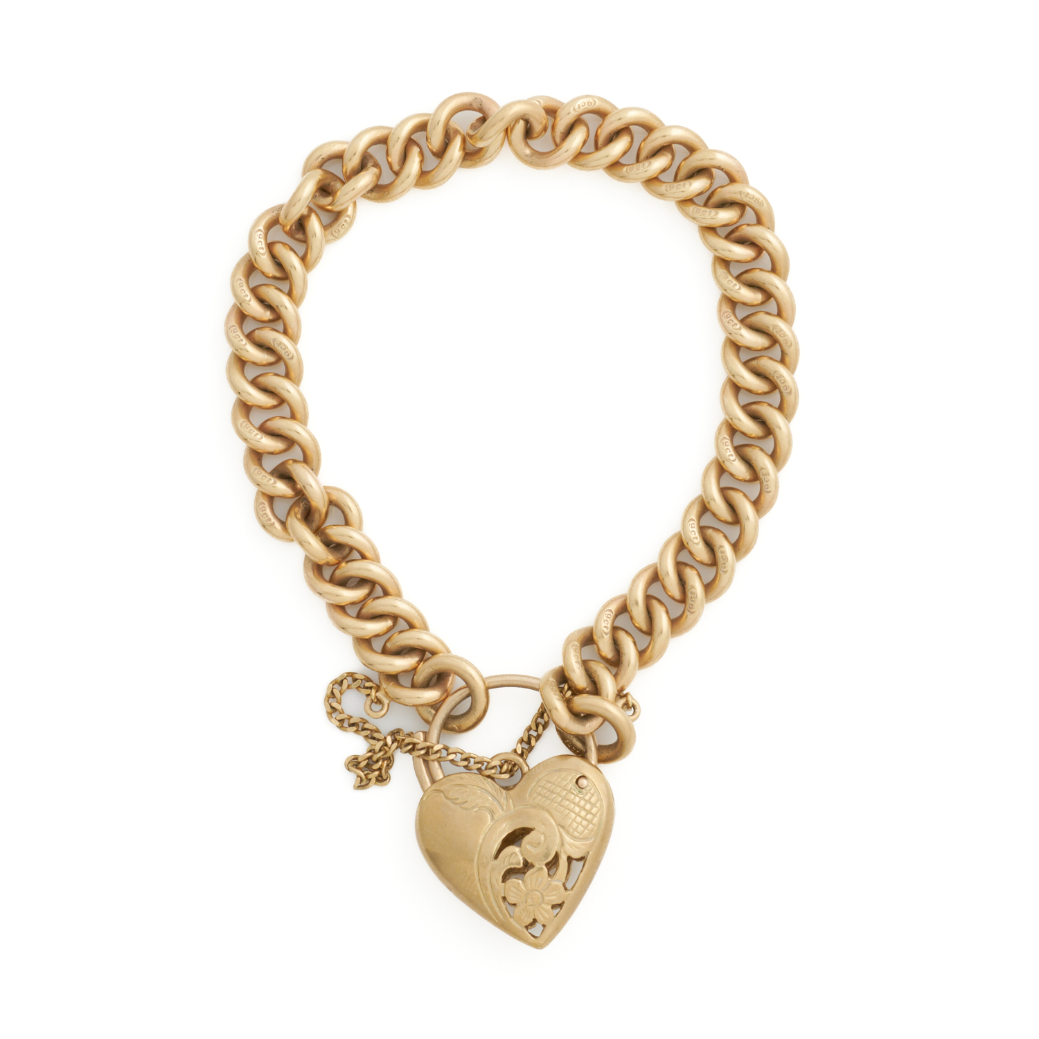 A CURBLINK BRACELET TO A HEART PADLOCK CLASP IN 9CT GOLD, 180MM, 40.7GMS