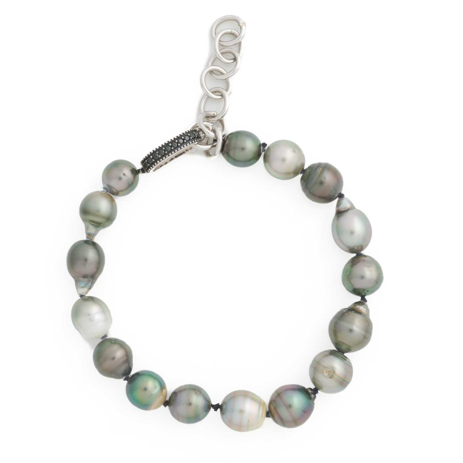 A TAHITIAN PEARL BRACELET TO A CLASP IN STERLING SILVER, EACH PEARL MEASURING APPROXIMATELY 10.9MM, ADJUSTABLE LENGTH 210 - 255MM