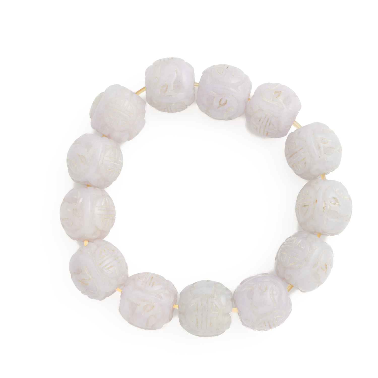 AN ENGRAVED LAVENDER JADE BRACELET IN ELASTIC, EACH BEAD APPROXIMATELY 18MM, INNER DIAMETER 100MM, 132.8GMS, ACCOMPANIED BY A VALUATION