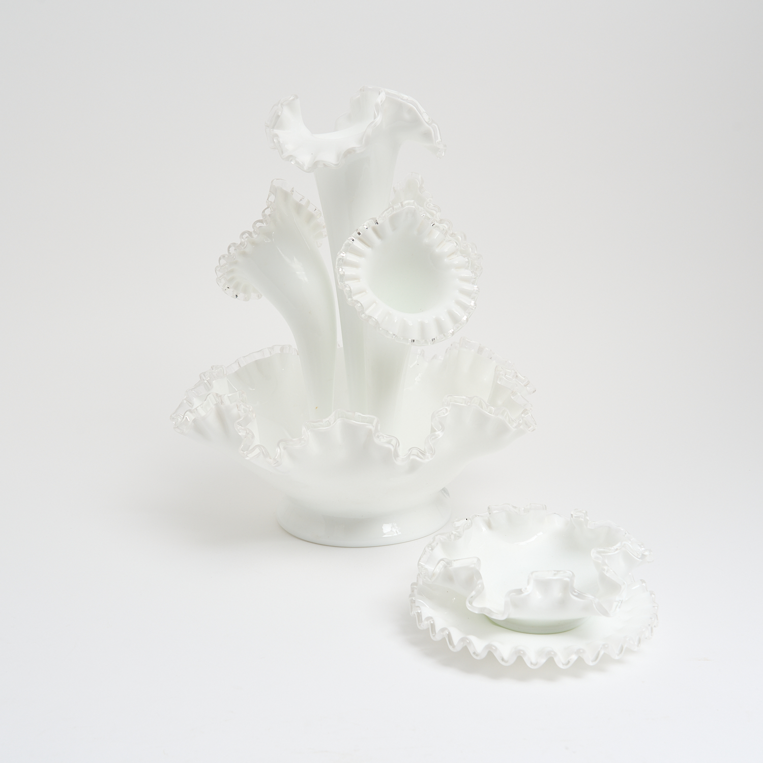 A FRILLED GLASS EPERGNE, TOGETHER WITH TWO MATCHING DISHES H.35CM (TALLEST)