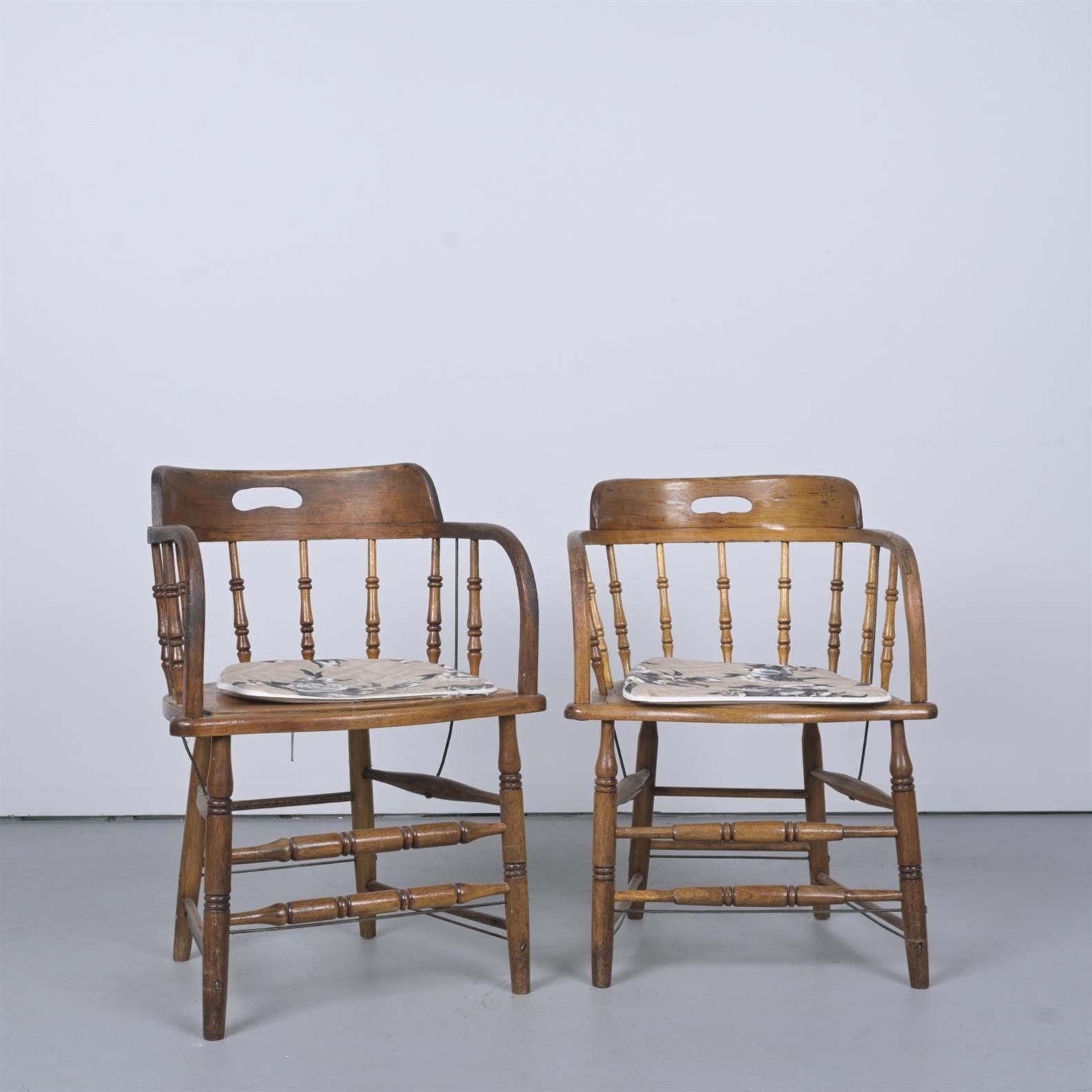 A PAIR OF HARDWOOD DESK CHAIRS (77CM H X 51CM W X 46CM D)