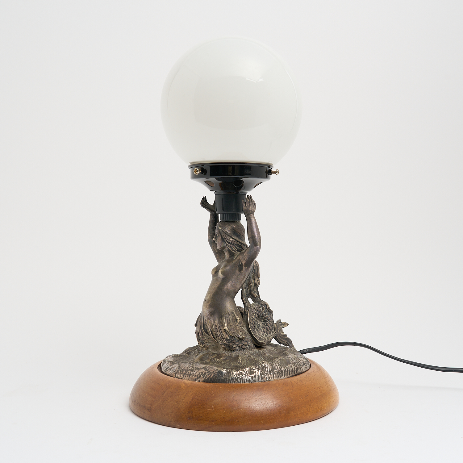 A FIGURAL CAST METAL TABLE LAMP OF A SIREN ON A WOODEN BASE H.39CM