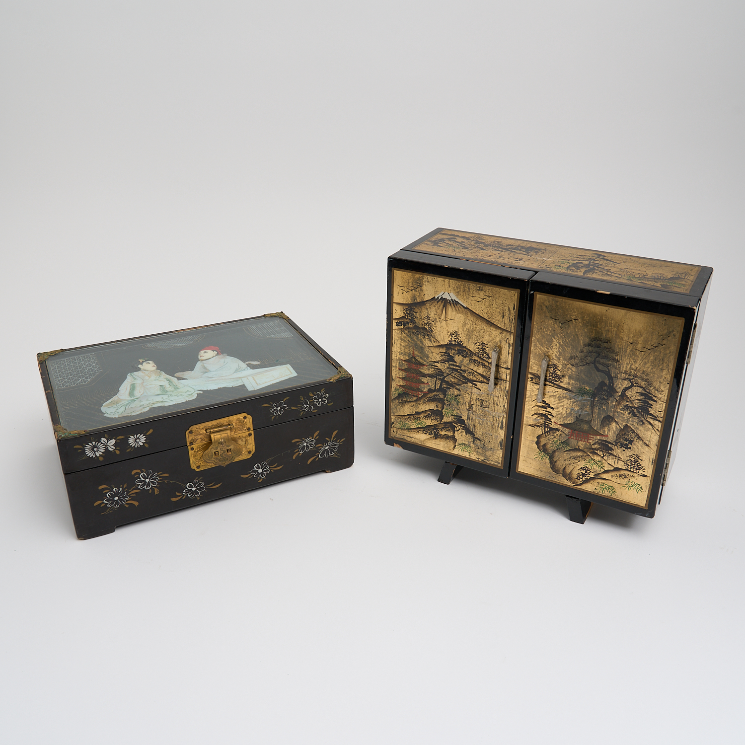TWO LACQUERED JEWELRY BOXES INCLUDING ONE WITH A MUSIC BOX FEATURE (A/F) W.28CM (LARGEST)