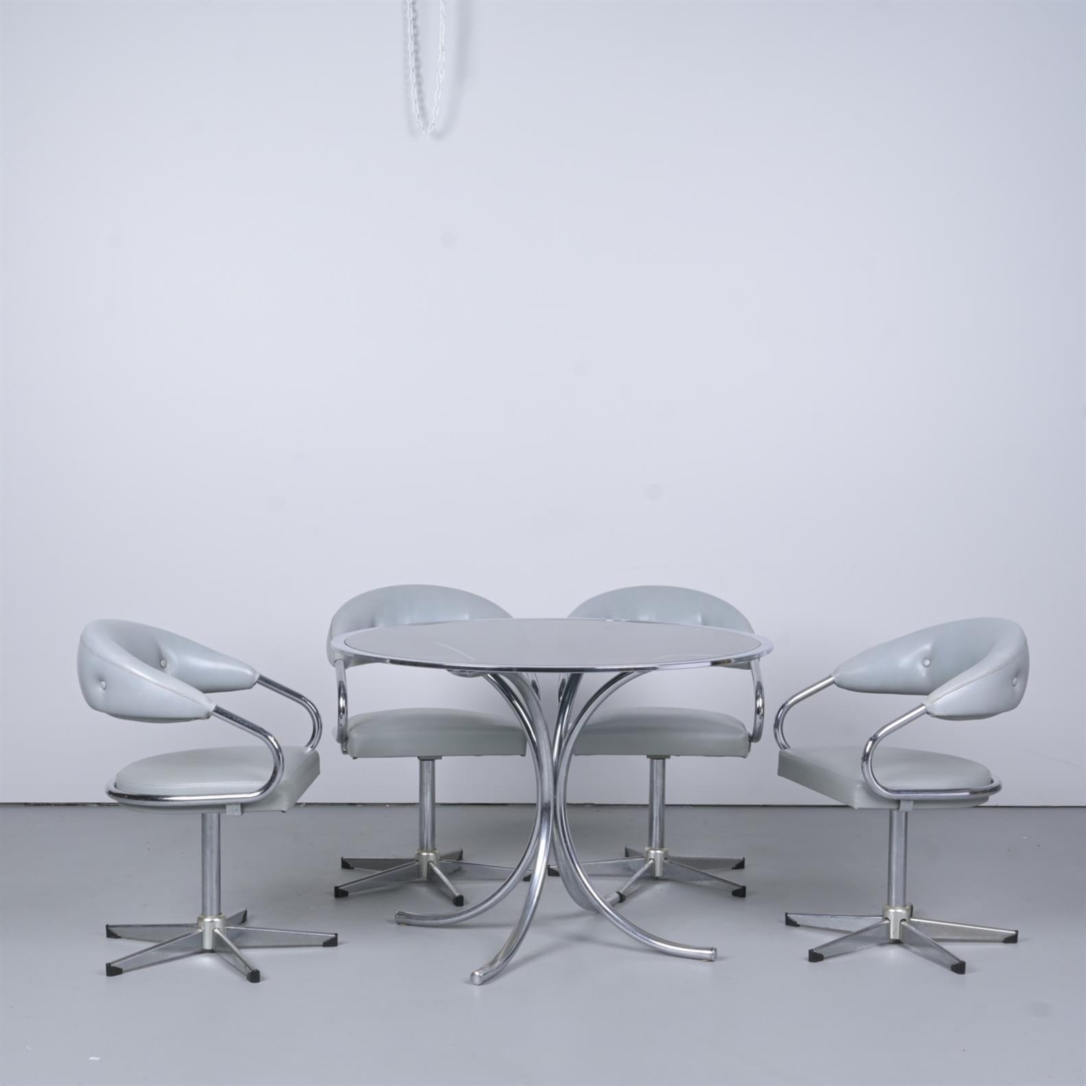 A FIVE PIECE MID-CENTURY DINING SETTING, INCLUDING TABLE AND FOUR CHAIRS (74CM H X 106CM DIA)