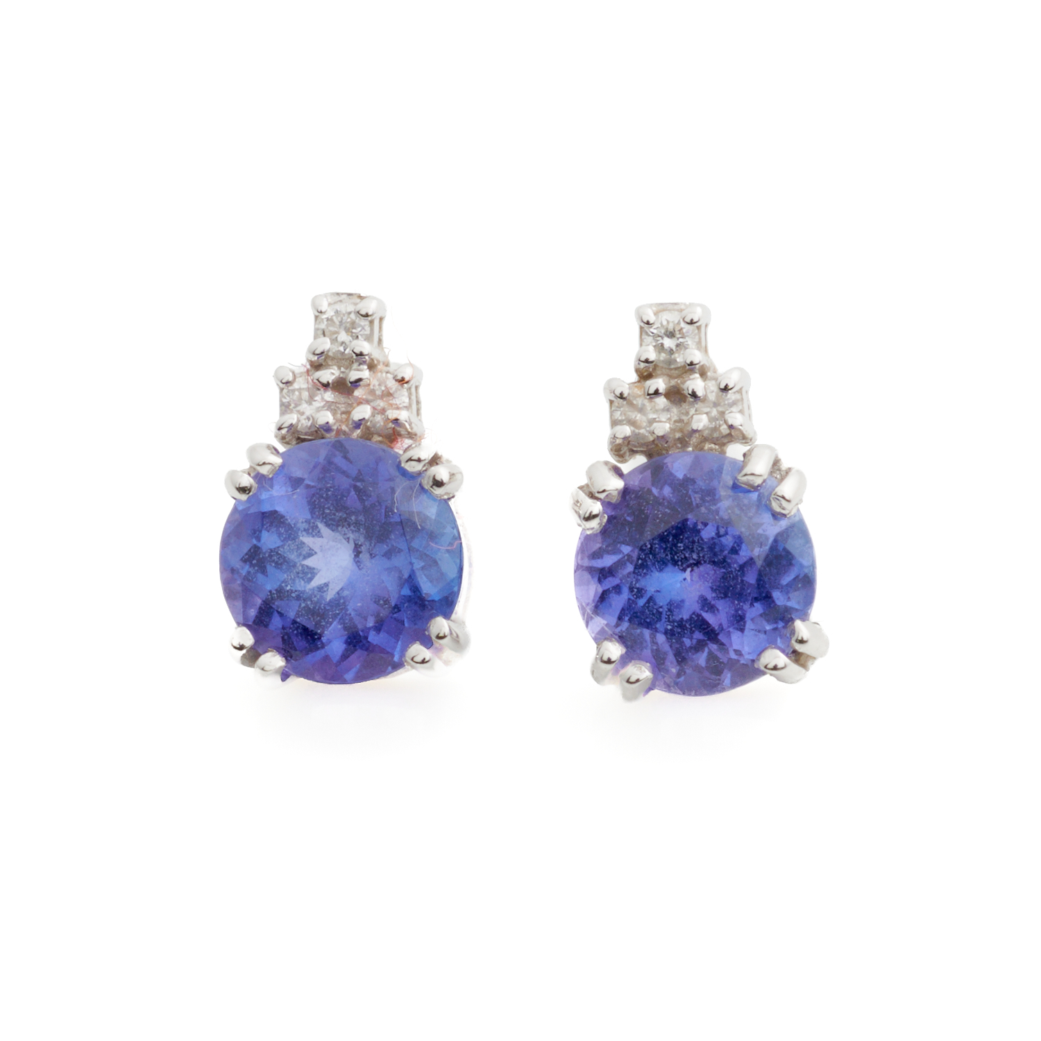 A PAIR OF TANZANITE EARRINGS IN WHITE GOLD TO POST FITTINGS IN 18CT WHITE GOLD, 15MM, A/F (NO BACKINGS)