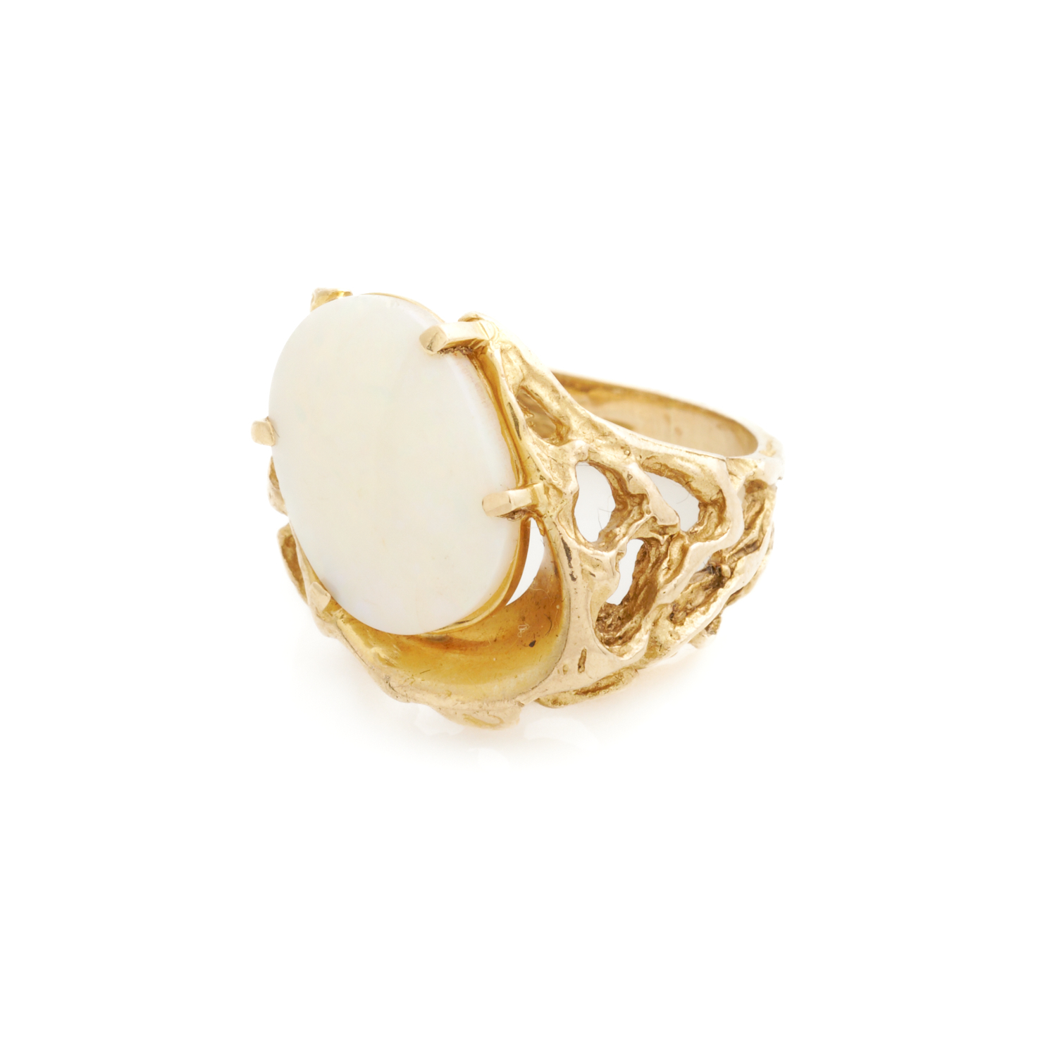 AN ORGANIC FORMED OPAL RING IN 10CT GOLD, THE OPAL MEASURING APPROXIMATELY 13.2 X 9.8MM, SIZE G 1/2, 4.9GMS