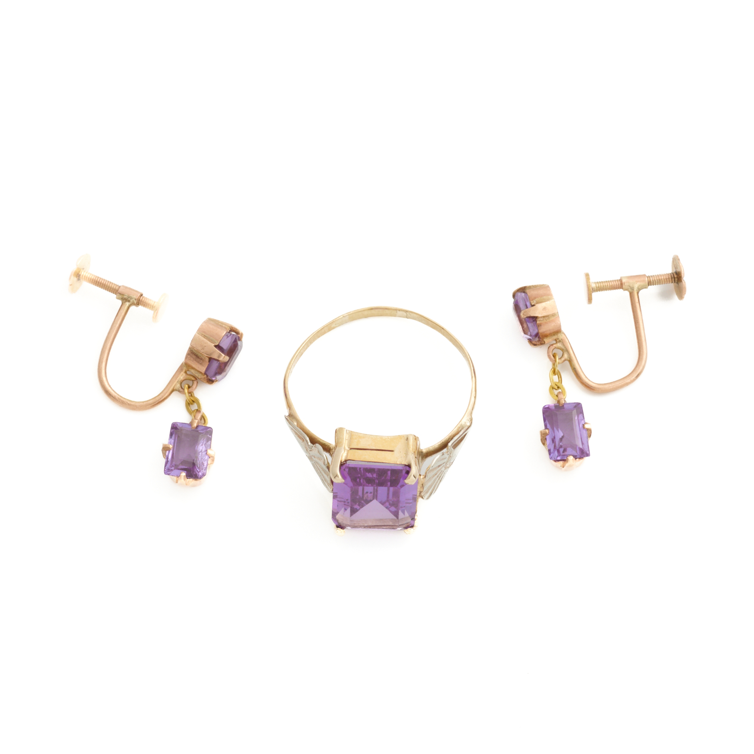 A SYNTHETIC ALEXANDRITE SUITE IN 9CT GOLD, COMPRISING OF A RING, SIZE N 1/2, TOGETHER WITH A PAIR OF EARRINGS TO SCREW BACK FITTINGS, DROP LENGTH 20MM, TOTAL WEIGHT 4.3GMS