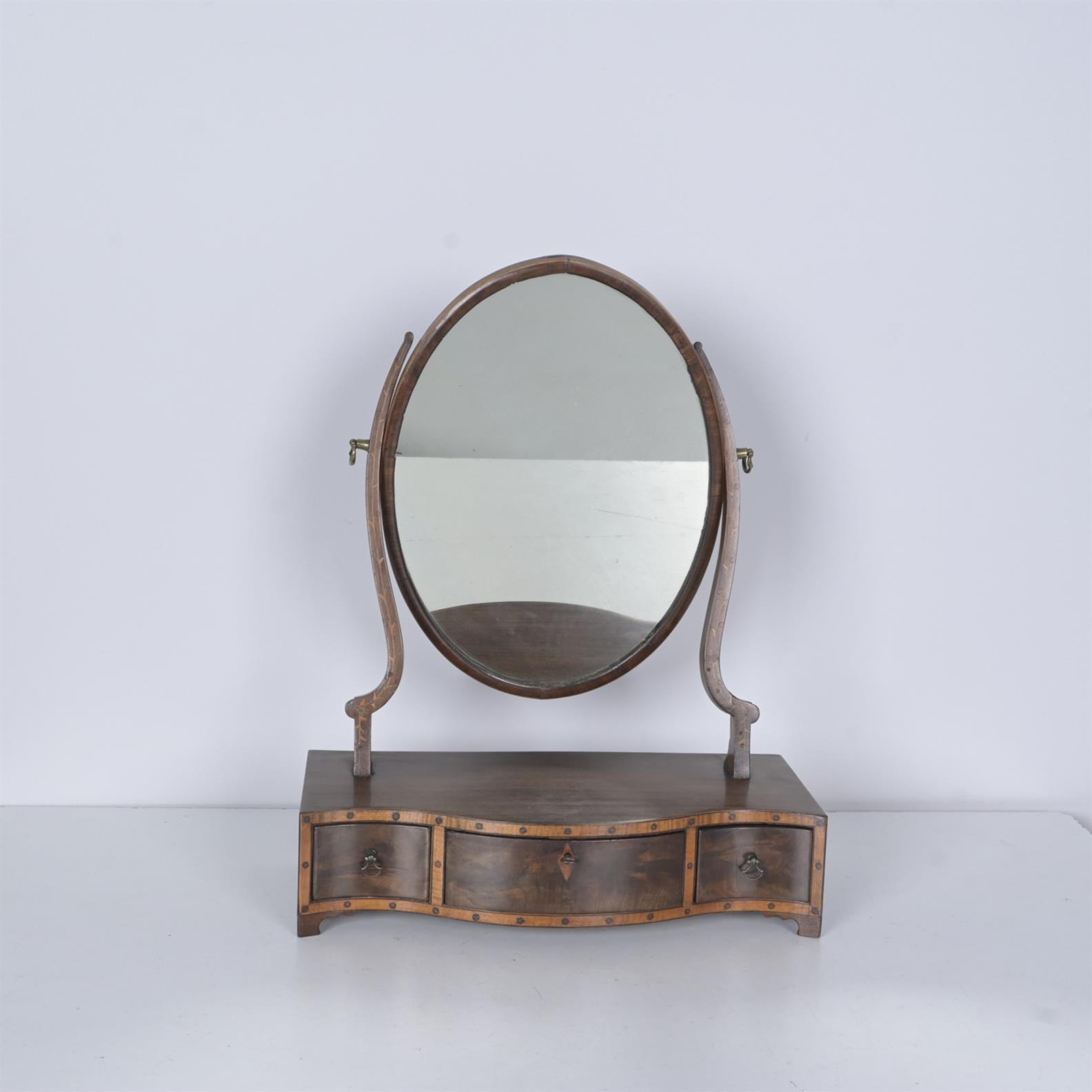 AN GEORGE III MAHOGANY AND INLAID DRESSING TABLE MIRROR (58CM H X 45CM W)